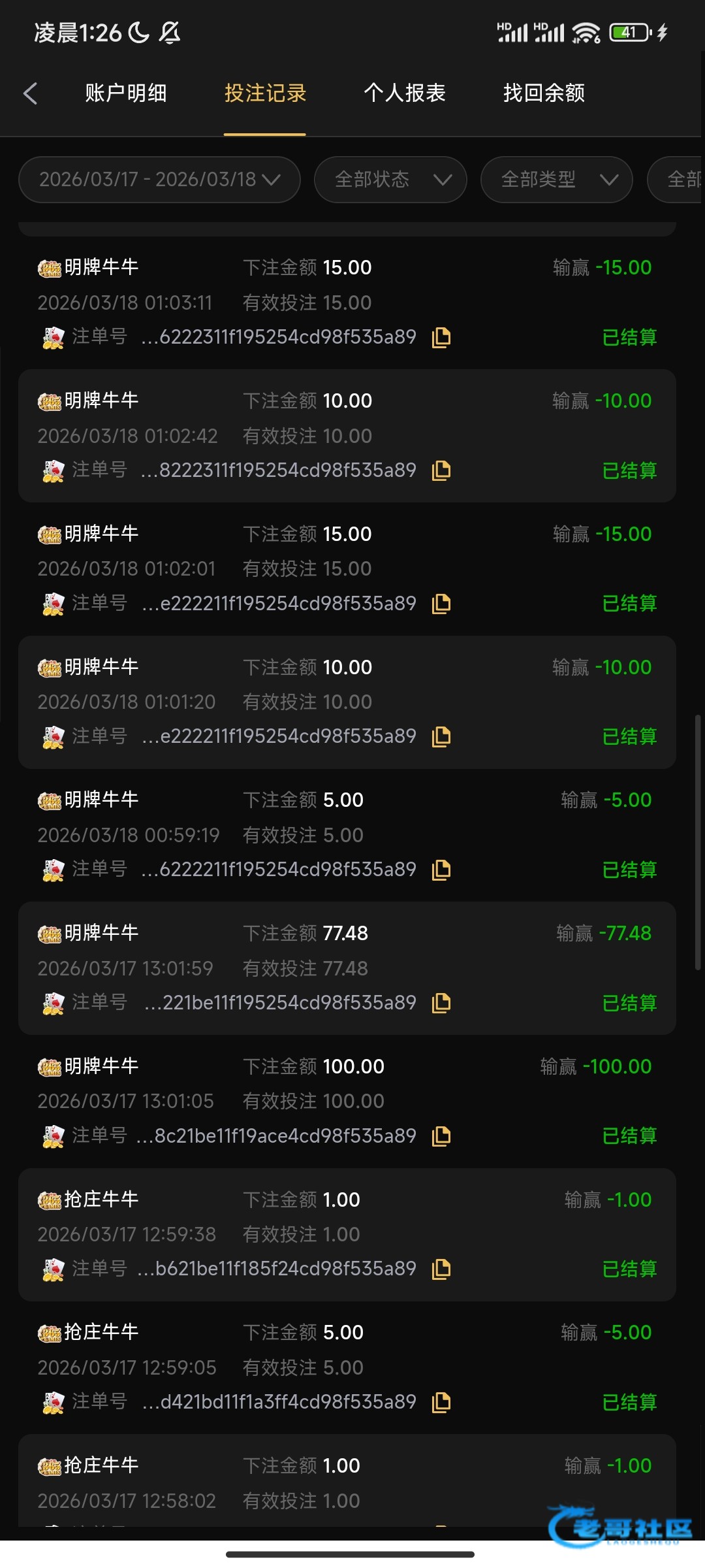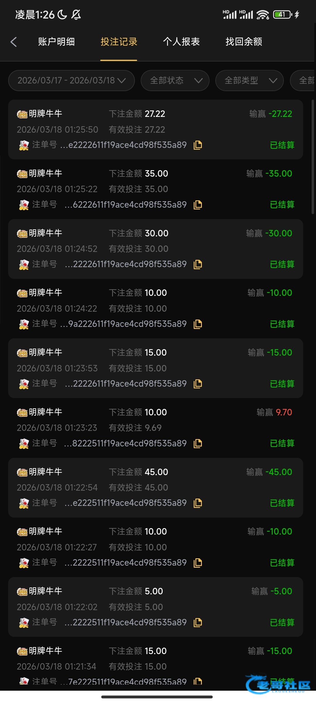 输100和70多的是抢庄了,除掉后26把 全是不抢庄不加注,只有2把牌比得过庄!!最后3把看我输得慢,我没抢庄其他...