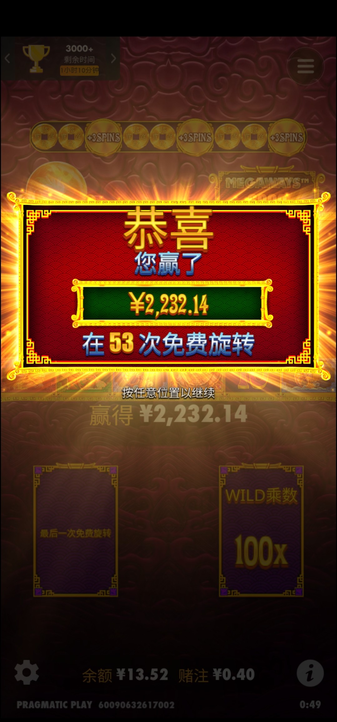 星空三百上3300,八千倍,200块买的免费,五金狮2真牛皮,我看到论坛有个老哥满倍就去打的,发帖纪念一下人生中第...