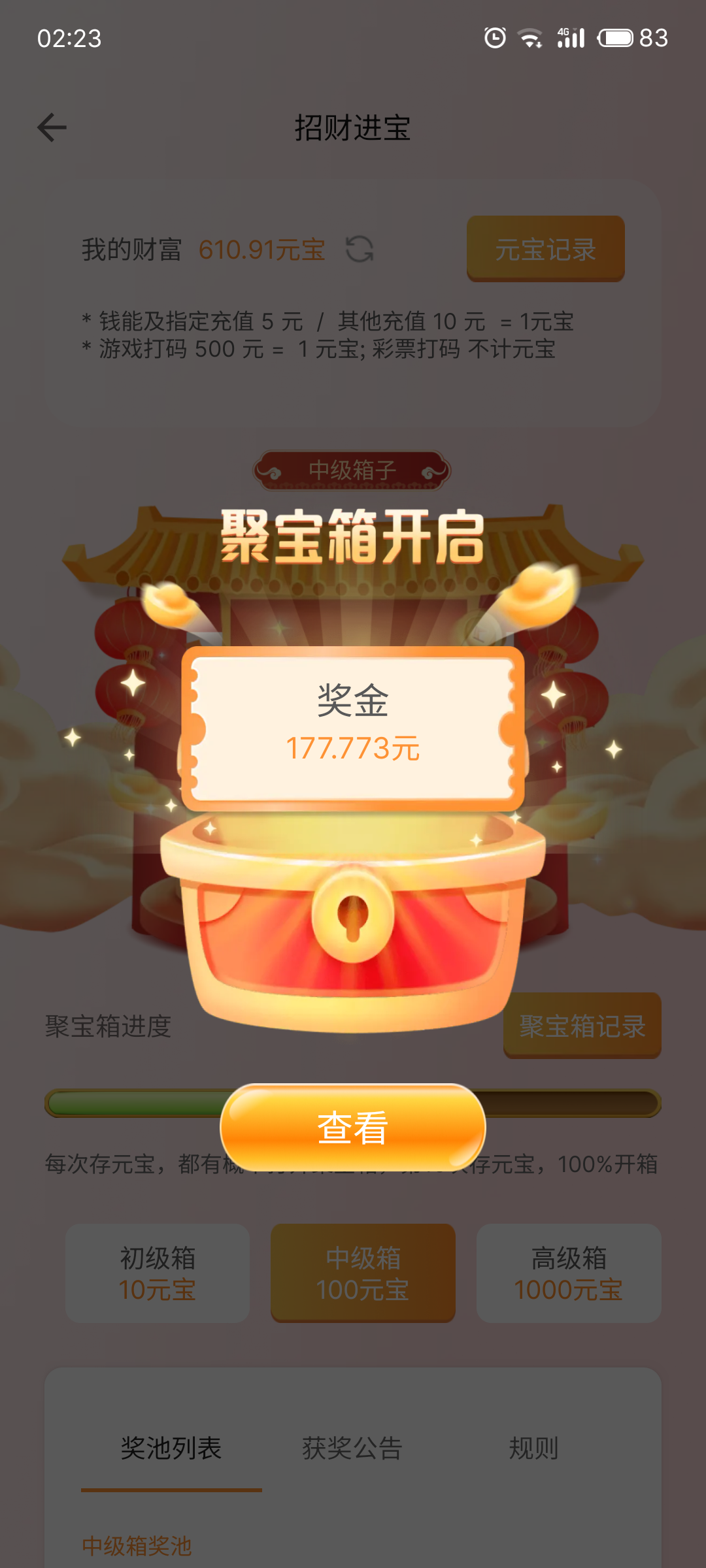 773元宝摇奖开了 4 下就出来了,运气好