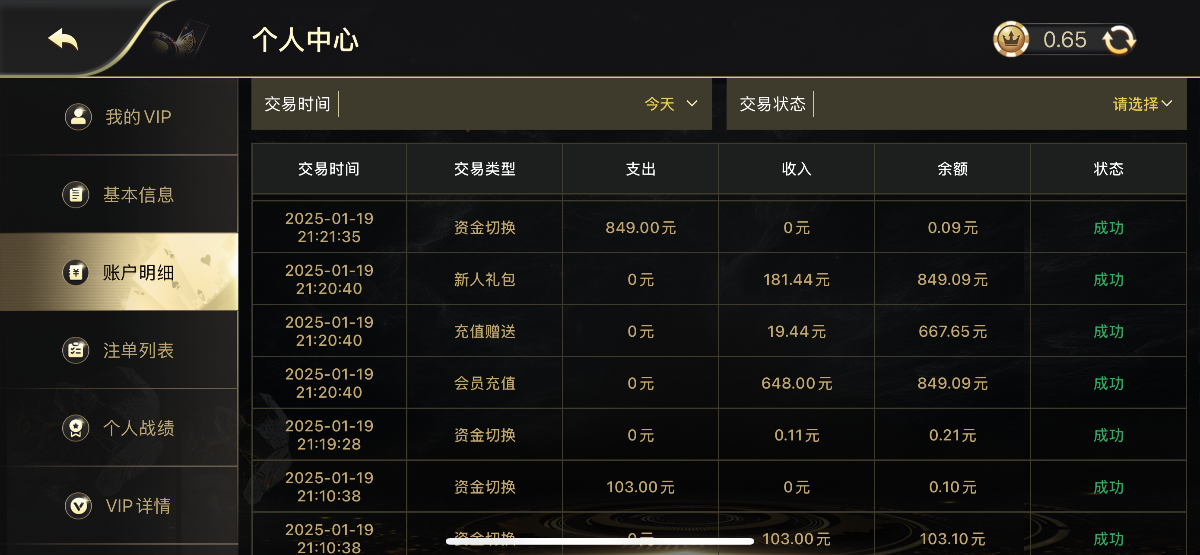 锦辉领的白嫖成功,20彩金,麻二0.8胡160,出款103,到账100.94