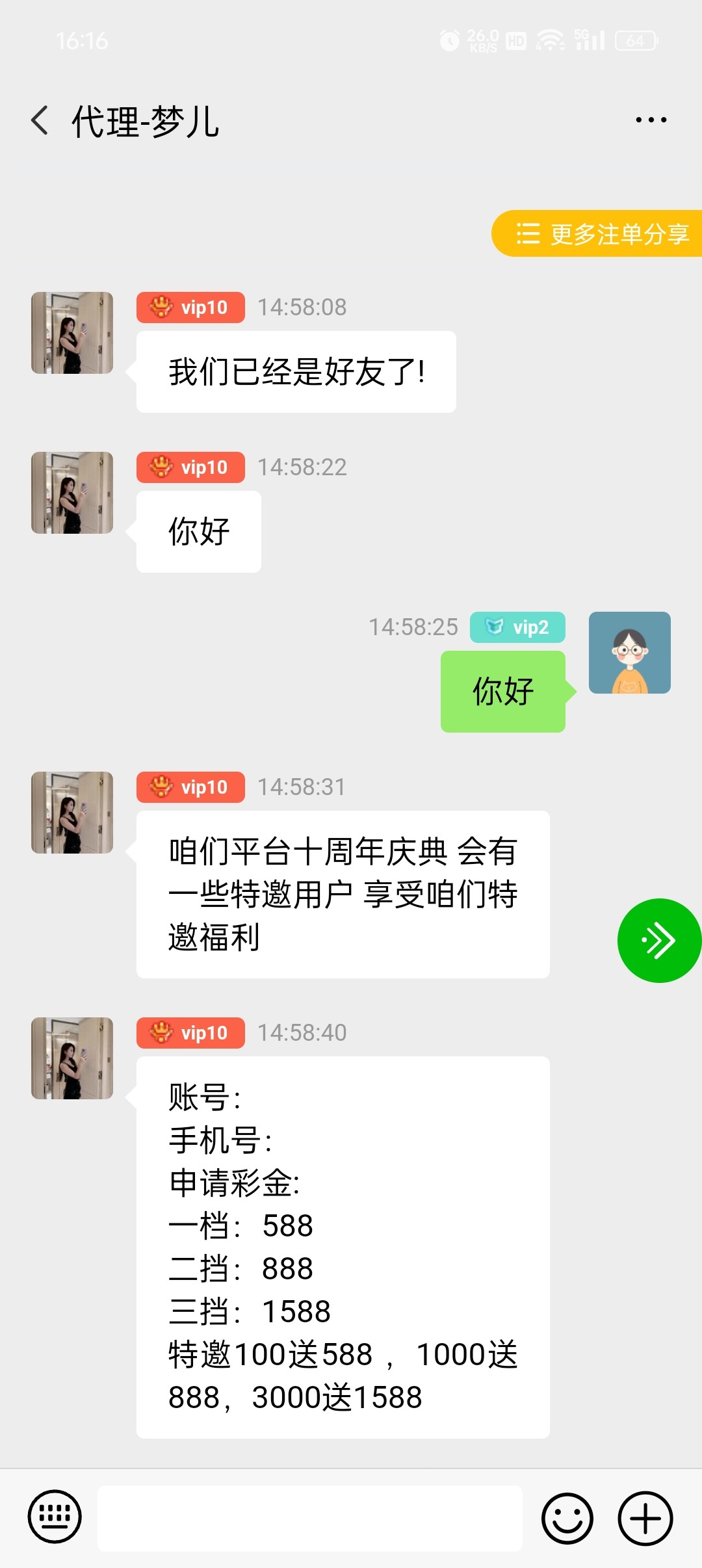 微信有人加我说,寰宇冲 100 送 588,冲完才知道分十天还得每天冲 100