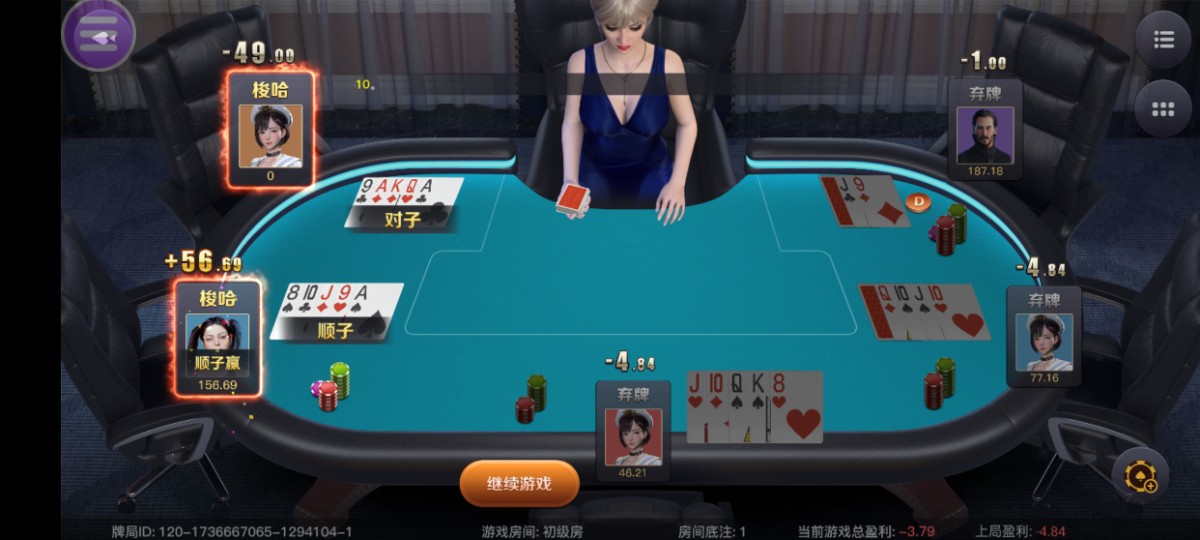 又有老哥睡不着咯,问鼎里的BG棋牌梭哈,对A遇到8910JA的顺子,哈哈,又有老哥睡不着啦!