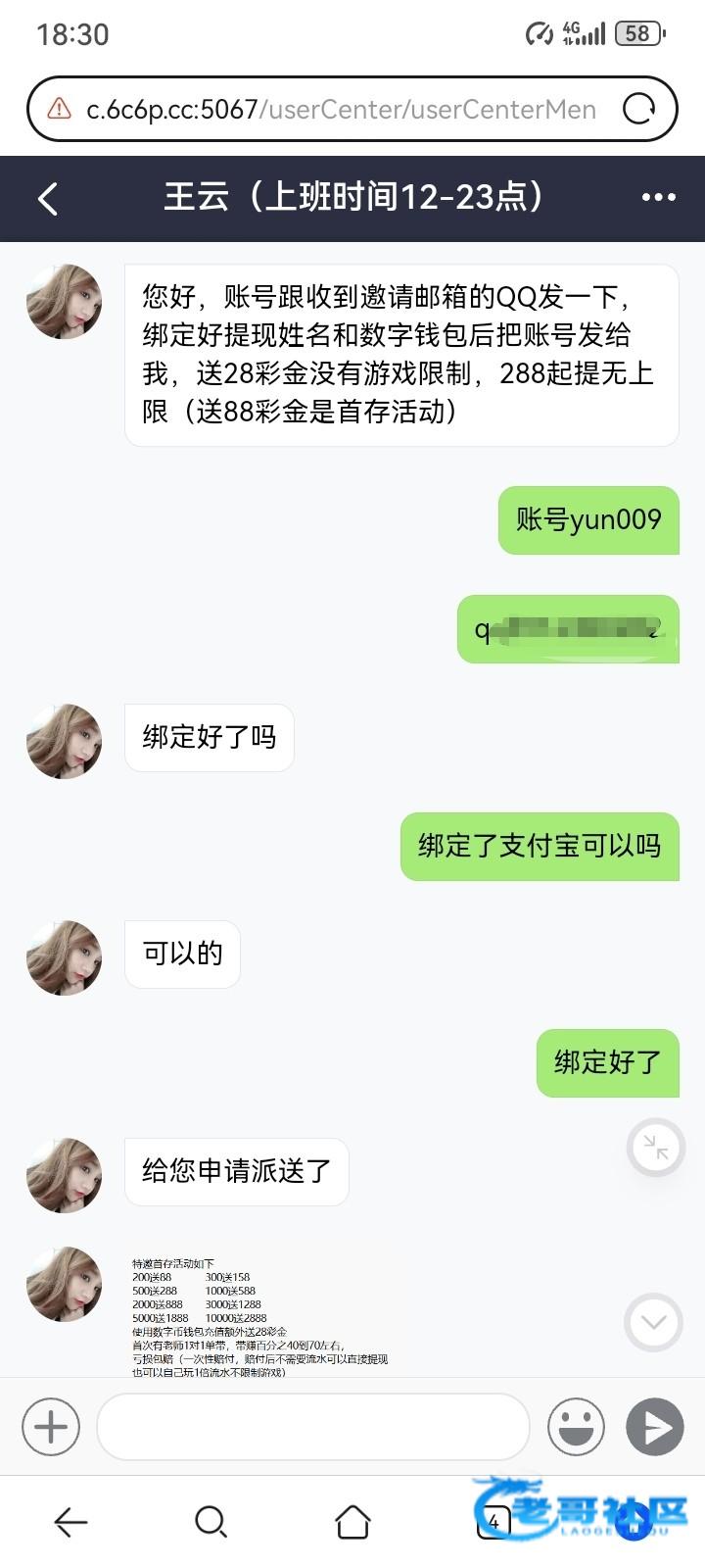 10月份也是这个台,也是这个王云接待 充值100送88.输了说包赔,结果套路是在充值才能给你赔一半 后面提现直接不给出