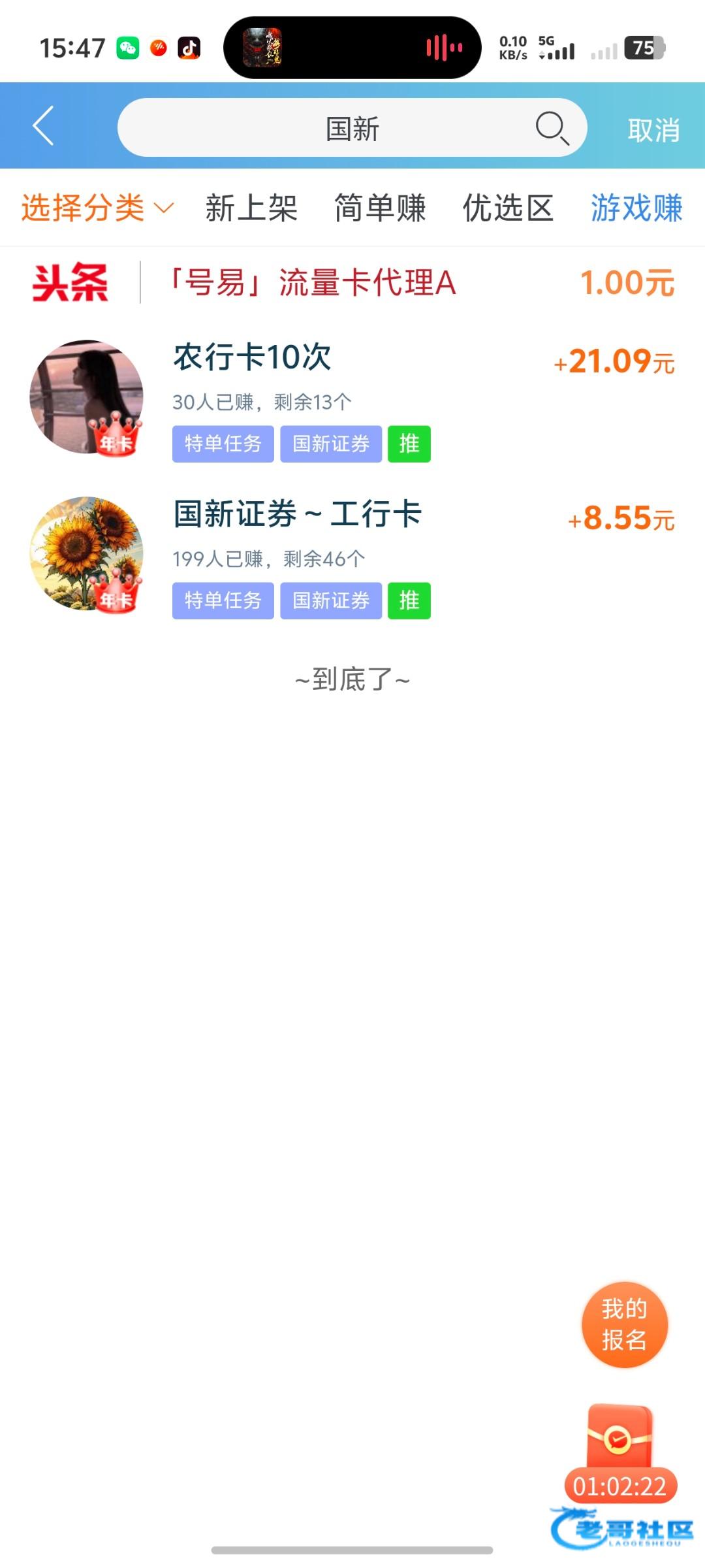 有农行卡工行卡的去任务平台接任务 20+10 没有这两个的只有10 国新证券app中间发现横幅神机妙算那个
