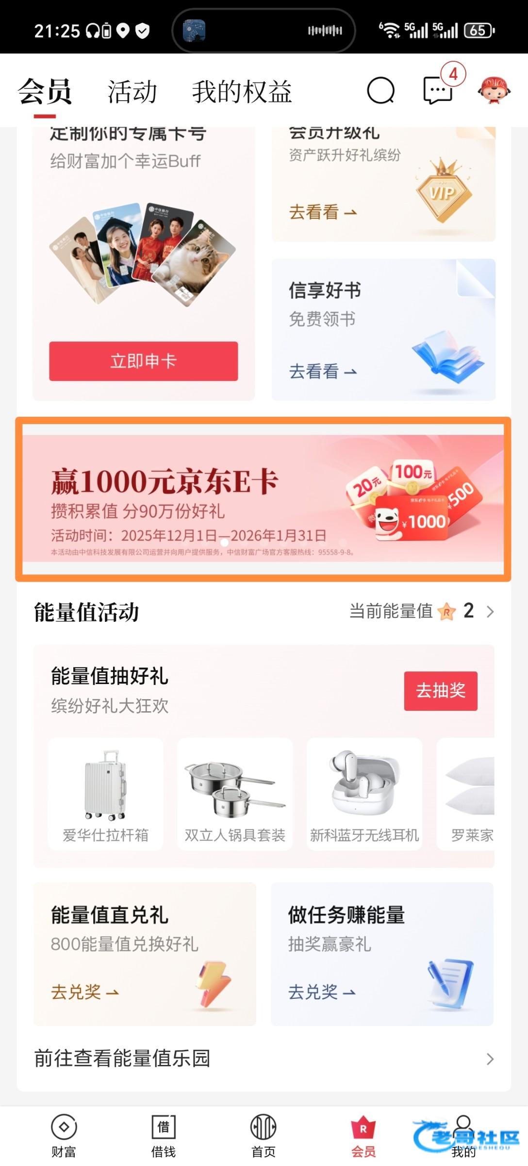 中信银行点会员,点这个活动赢1000元京东E卡,把里面任务全做了,我做了几个,最低一块立减金,抽了第五次抽中100立减金,吃不起饭的老哥不嫌麻烦就去撸一下