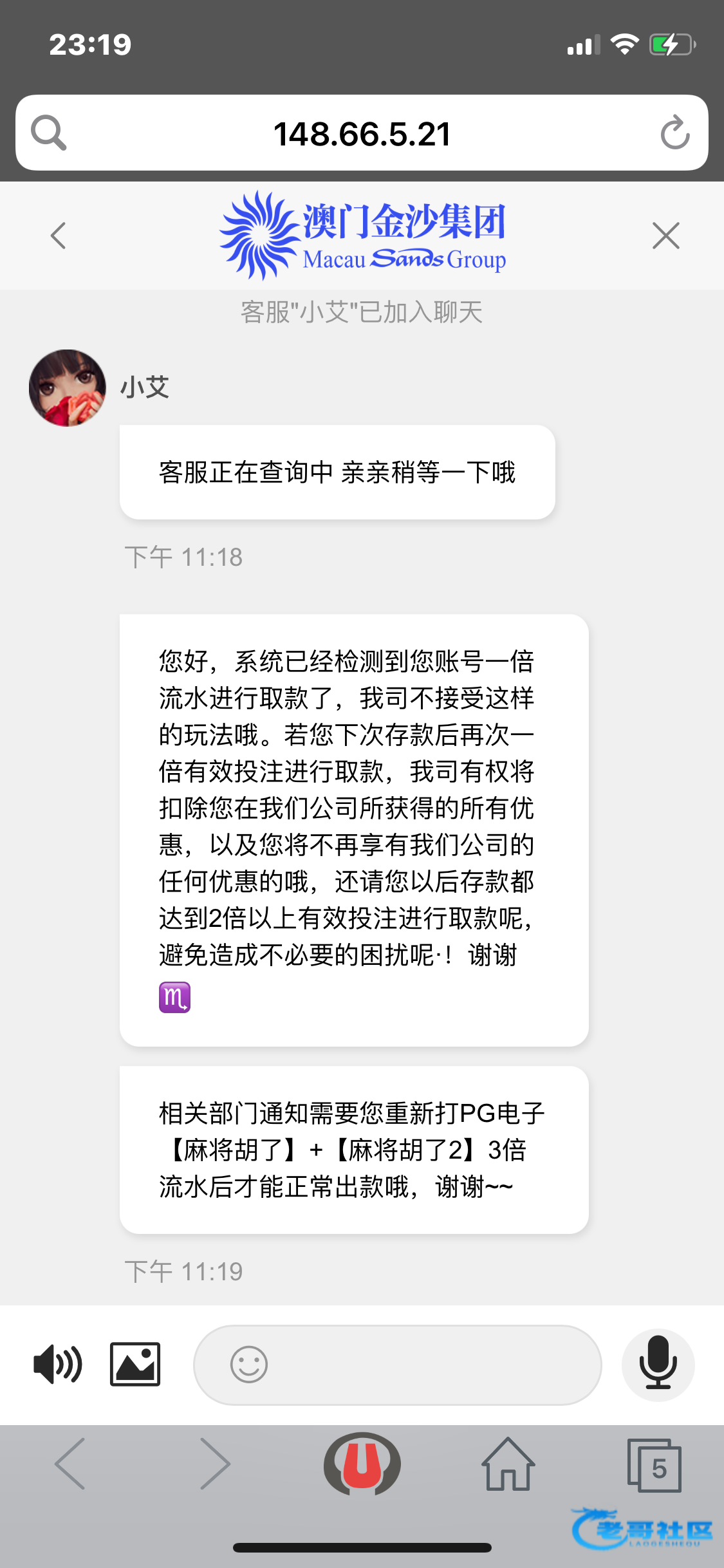 前两天充值了1000打电子还有真人上3000打了最少三四倍流水这傻逼客服说我打一倍流水罚我三倍流水,而且还只能玩pg进免费直接空转一倍最后可想而知连本金都拿不回 这两个逼平台也是老平台了还搞这一出最近还出了个u台老哥注意点