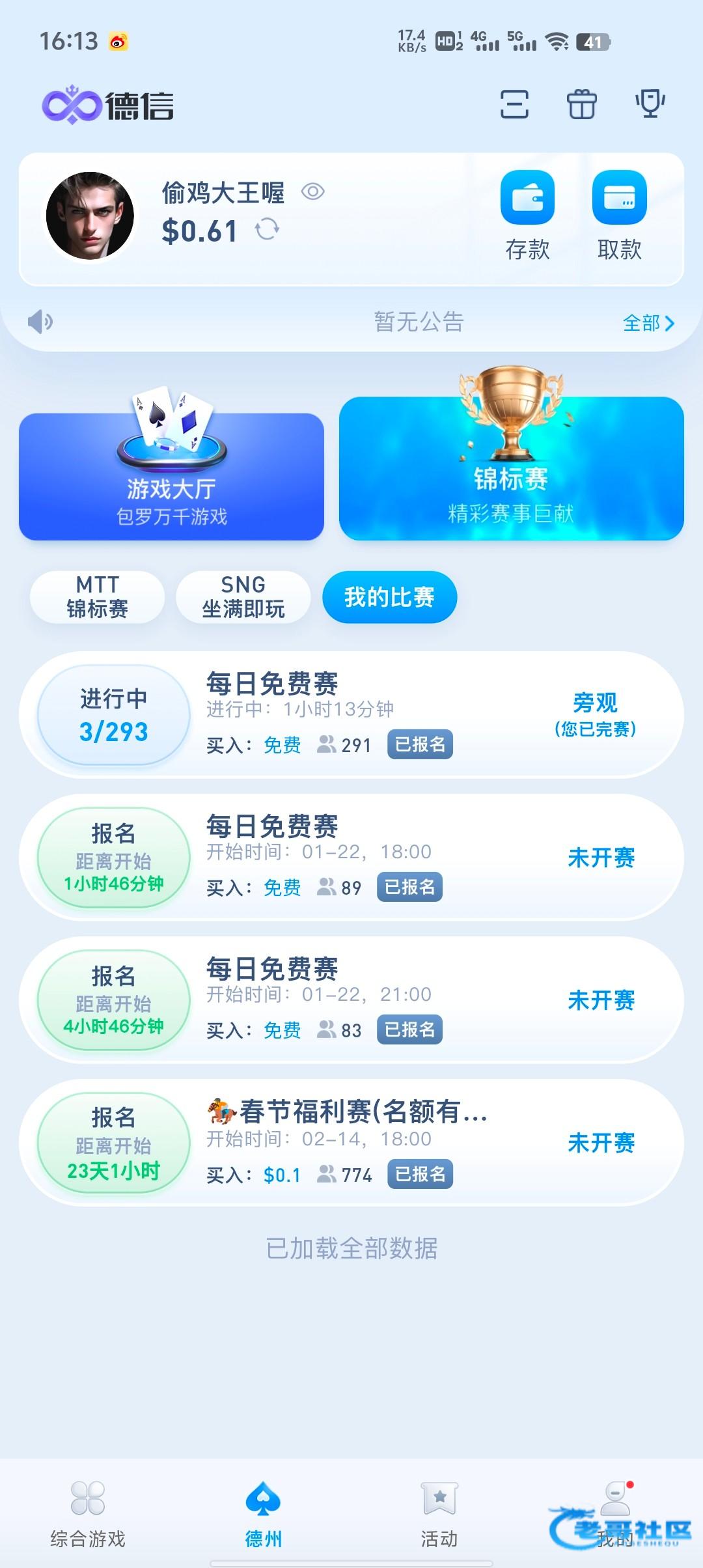 这个每天有四场免费赛,12点,3点,6点,9点,只要打出够1.1u,就去打每日快速赛1.1,2.2的比赛这个基本没什么人报名玩,最多10人进,只要稳一点基本可以吃前三名,够50u就可以提了,我打了两天已经到账50,白嫖即可不要充值官网DX.vip