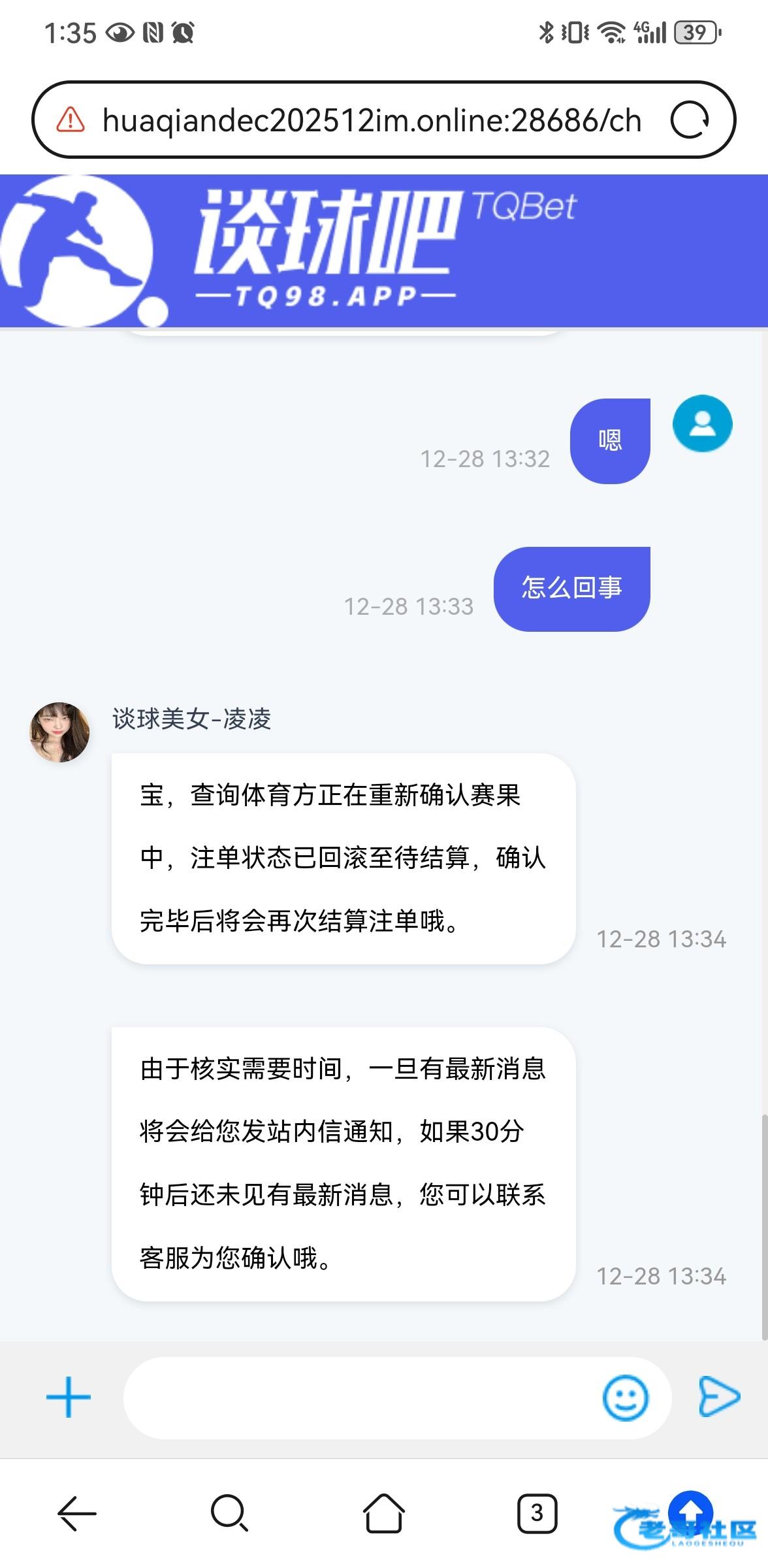 今天接到谈球吧的电话有优惠劵拿我就上了100,我比较喜欢玩体育,前面还正常,第二把的时候直接改结果14-18直接改成14-19,一开始以为我的看球软件有问题,直接去网上搜也是14-18,问客服一直不理。希望大家避坑!!!