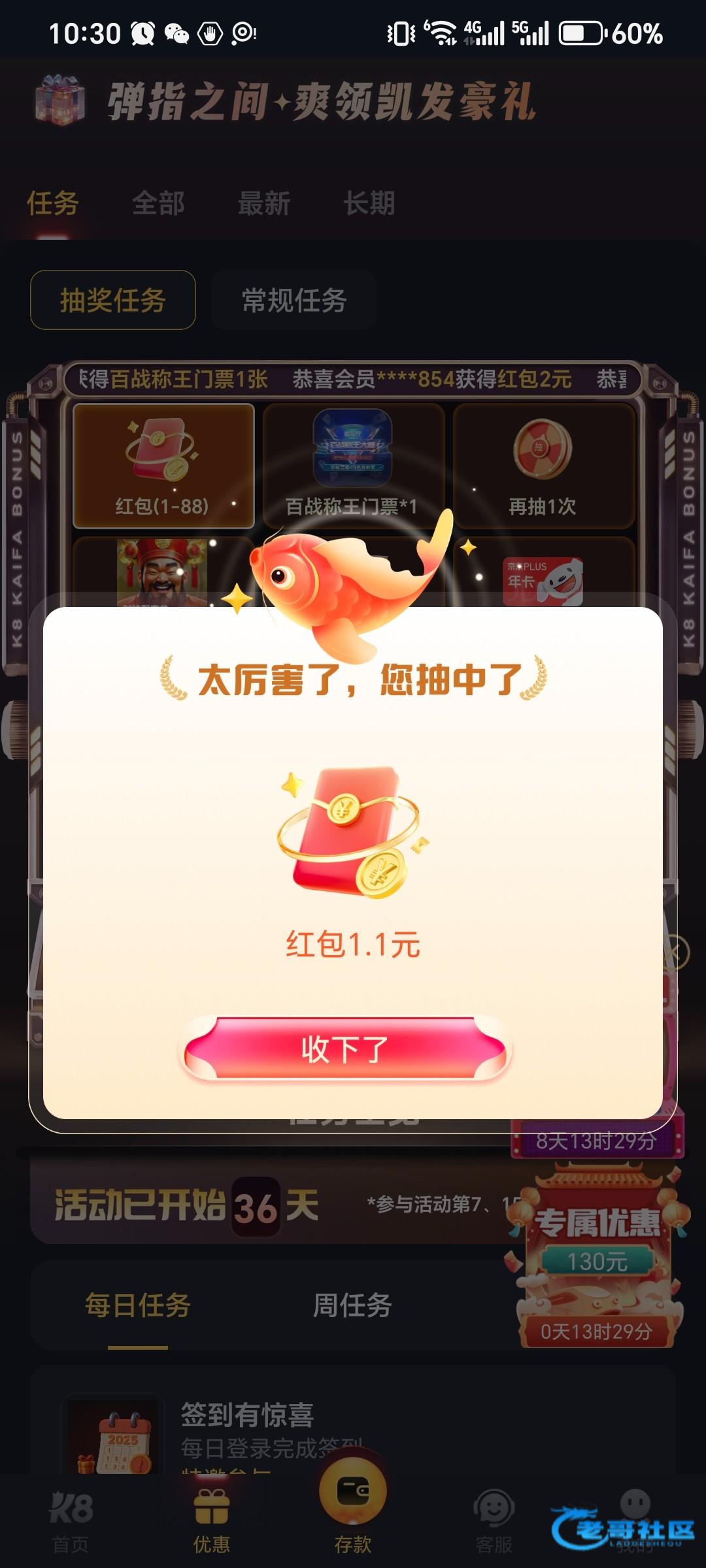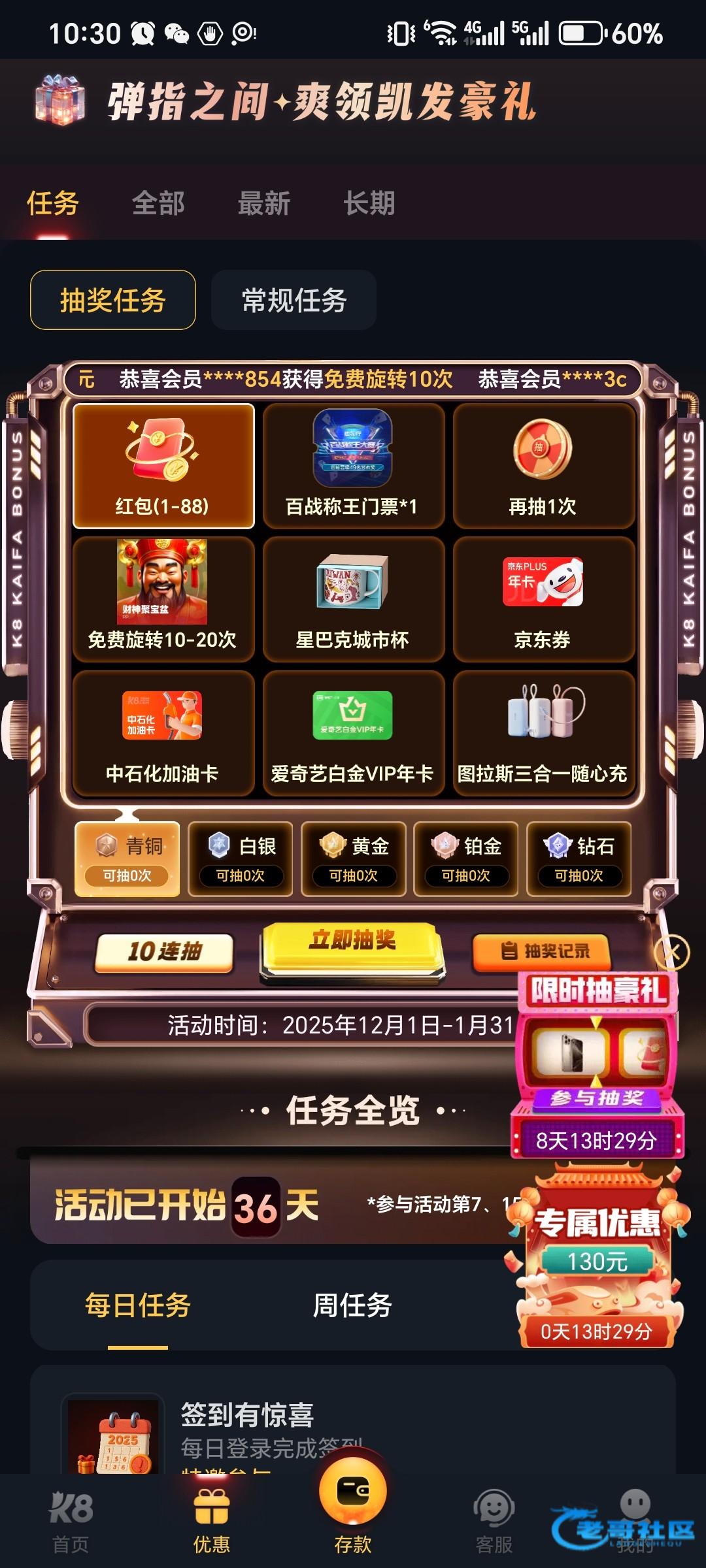 登录账号,我图里这个限时抽好礼,点进去,每天都可以签到(签到之前随便点个电子进去不用玩过几分钟再回这个界面就可以签到),基本就是三种奖品,红包或者pp免费旋转或者百家乐门票,都有用。很久没充值过一个月一直在白嫖,pp那个爆奖也有几十,然后自己去打过关啥的,我今天今天十多块又打上400,有号的可以看看自己有没有这个活动,不知道是不是都有。网址k8.com