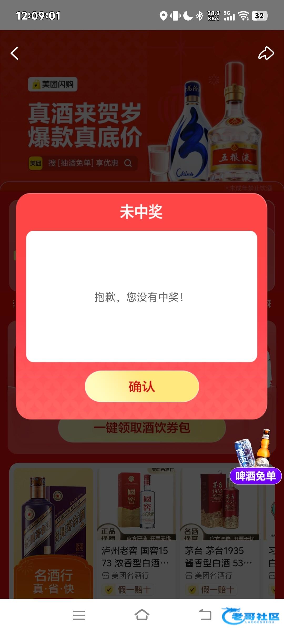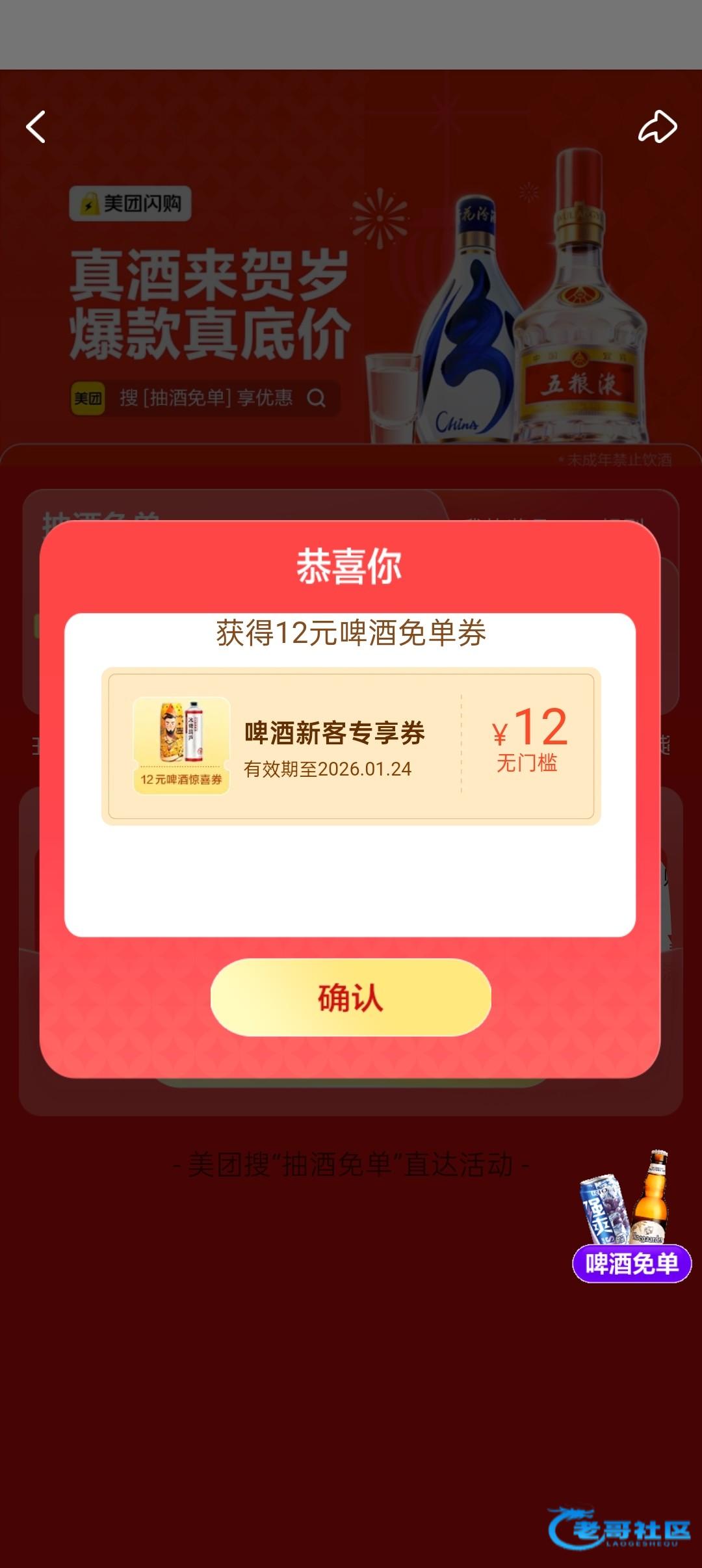 美团app首页搜索抽酒免单进入活动界面,有无限次的机会,可以中五粮液,基本都是12减12,可以半夜渴了买点啤酒喝解解渴。