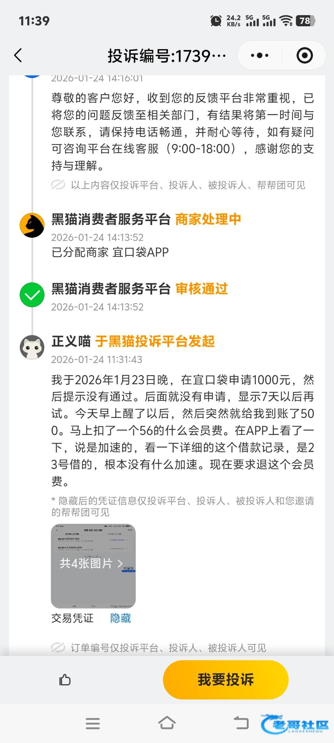借500扣176 投诉也没有人理 老哥们宜口贷借了2000拒绝贷款 然后自动给我借500扣除176元会员费 打电话找客服都是说专员联系 一个电话都没有打电话过来 黑猫上说专员联系不上我 还有啥办法能退款