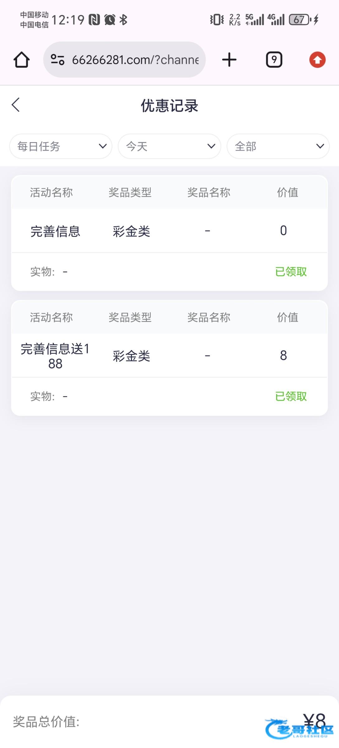 这个网址里面这几个广告都是同一个系列,都注册绑定卡任务领取8,吊大的老哥去试试吧,我就领了一个平台8块没打出来,其他懒得弄了,看论坛的老哥说黑,也有出款的,黑了勿喷老哥们https://p3d6mfkx4.9n25zjg8t.com/