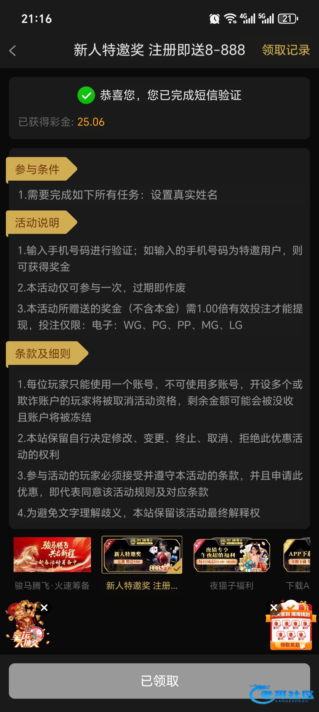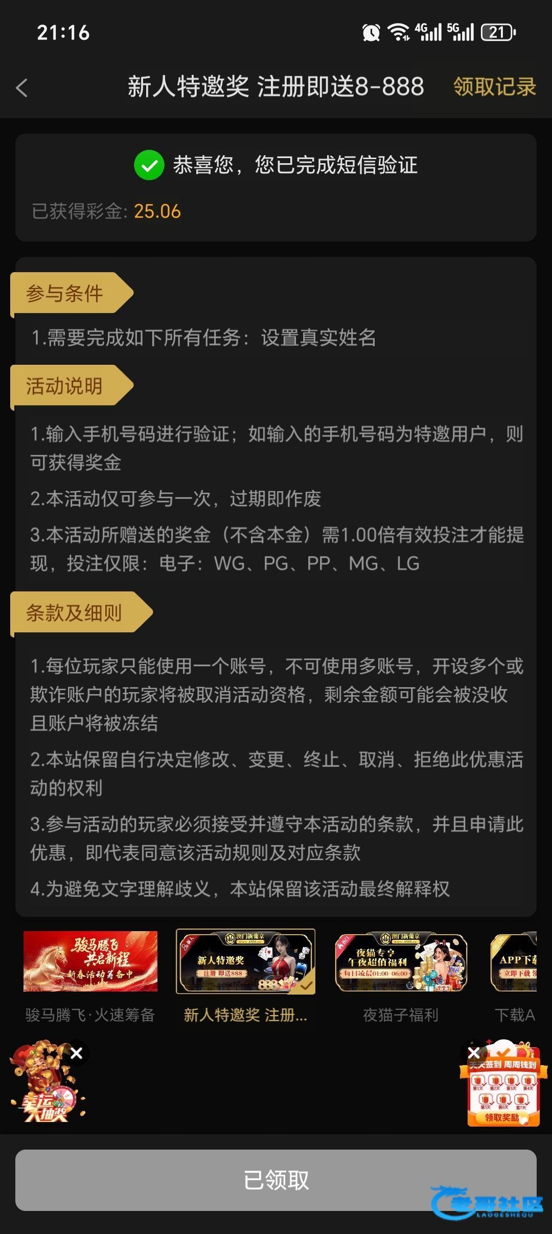 我领了25搞了一百回c打了半天打了3000多流水提了300.注意点直接打麻1千万别走0.2的我是四毛仔,0.2之间空到死,里面有个祥云下载添加领到了18加app28,分开领我没打出来88461.cc