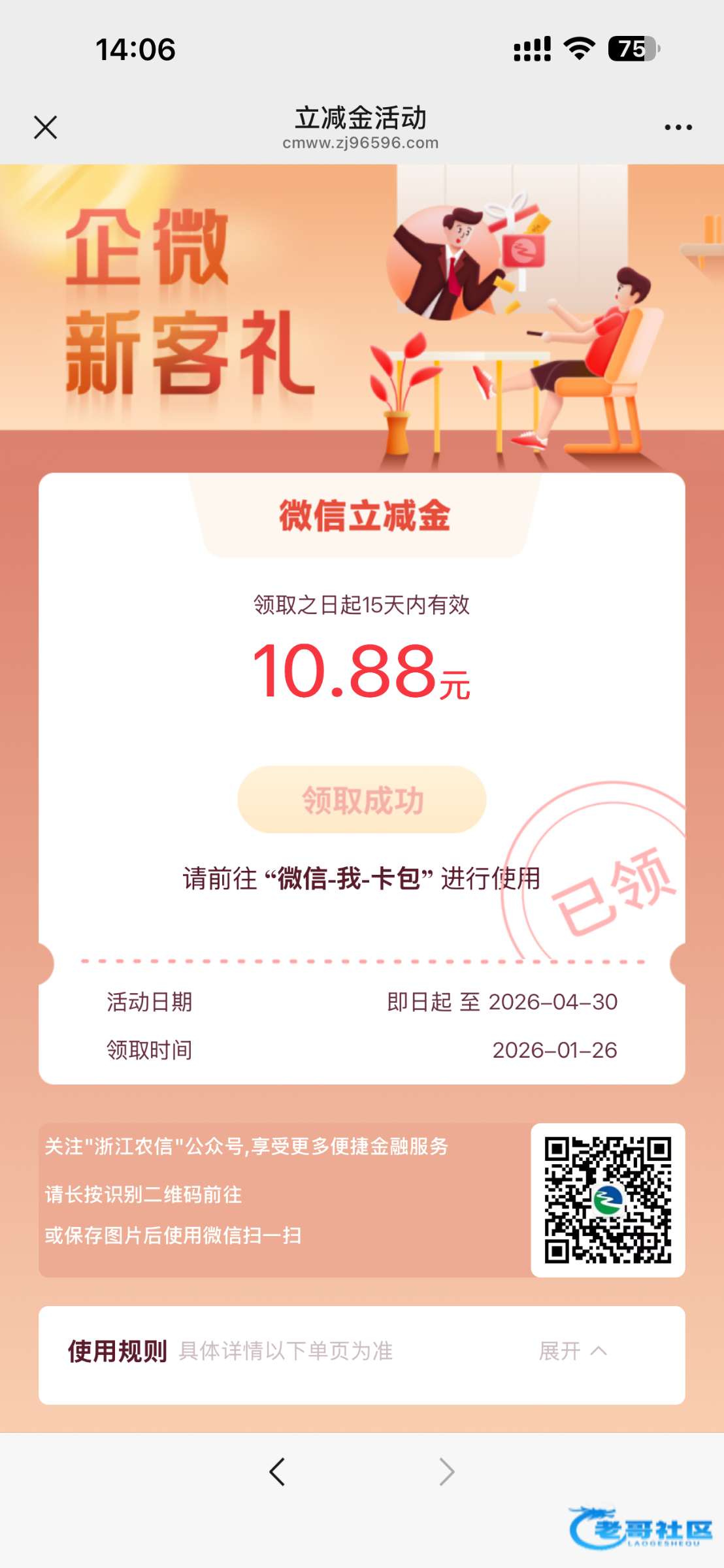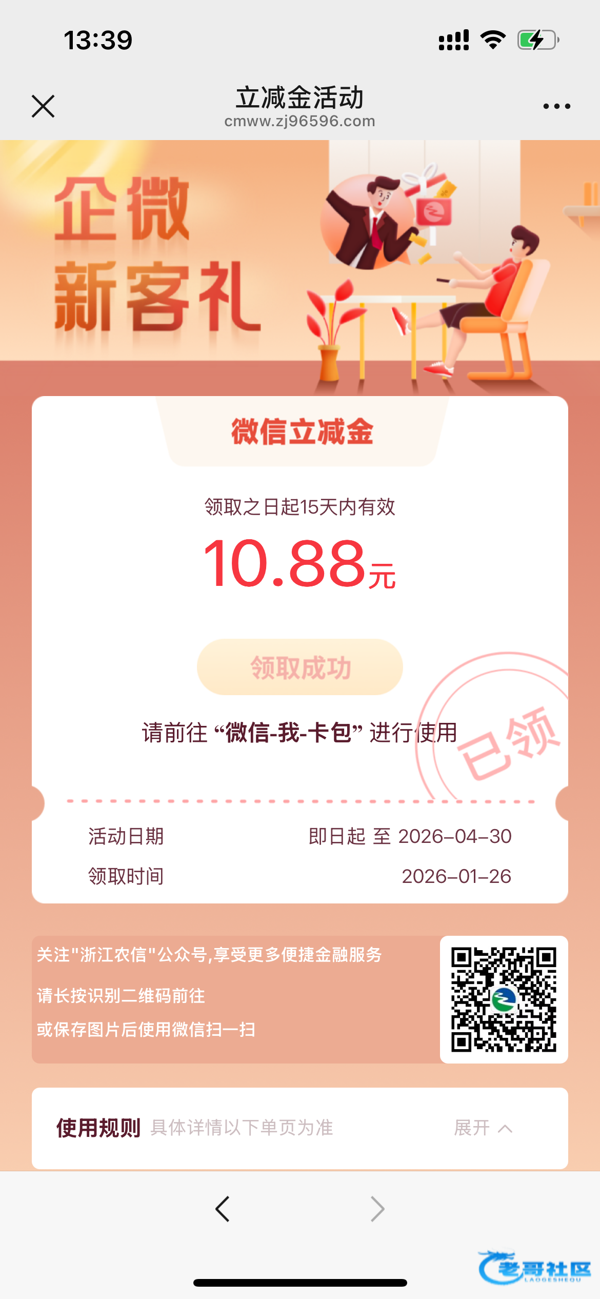微信简单授权一下,就可以领取了,不用开卡的