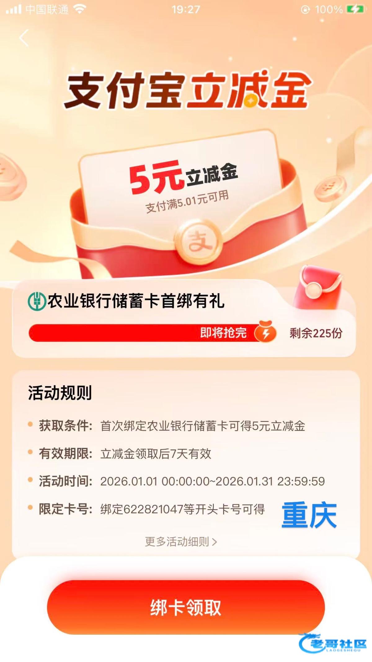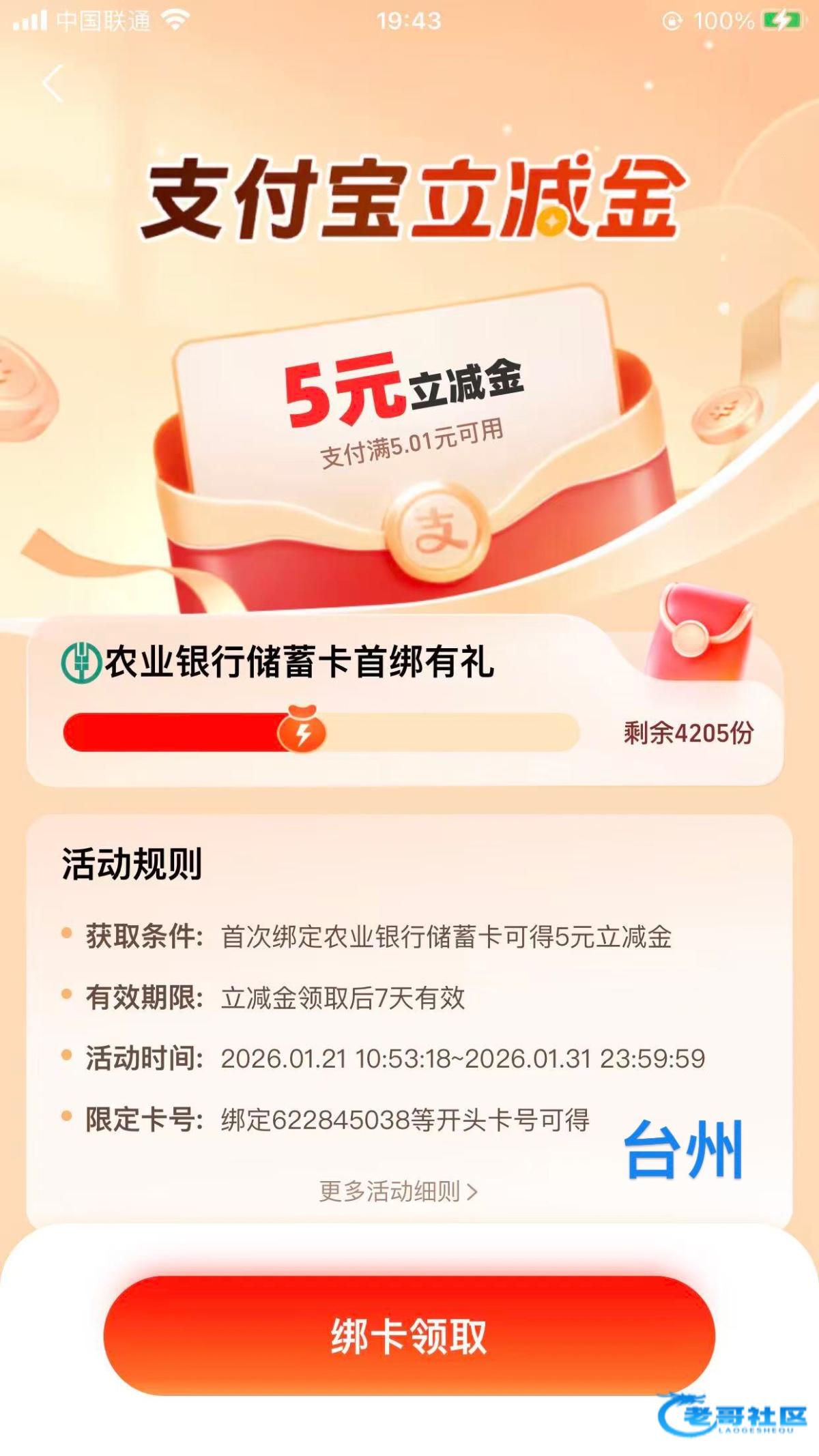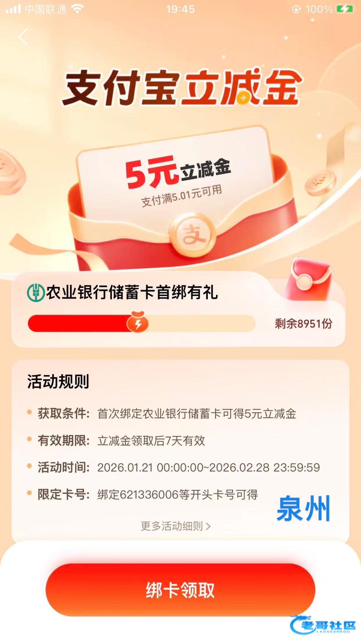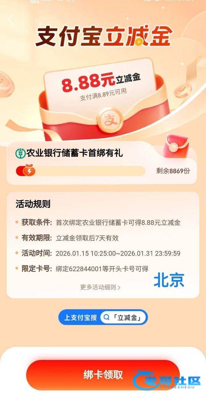 支付宝搜立减金最近山穷水尽了,看到支付宝绑卡立减金26年刷新了了,全给它撸了,每个图上都有对应的城市,用其它行的卡开农行三类,自选城市