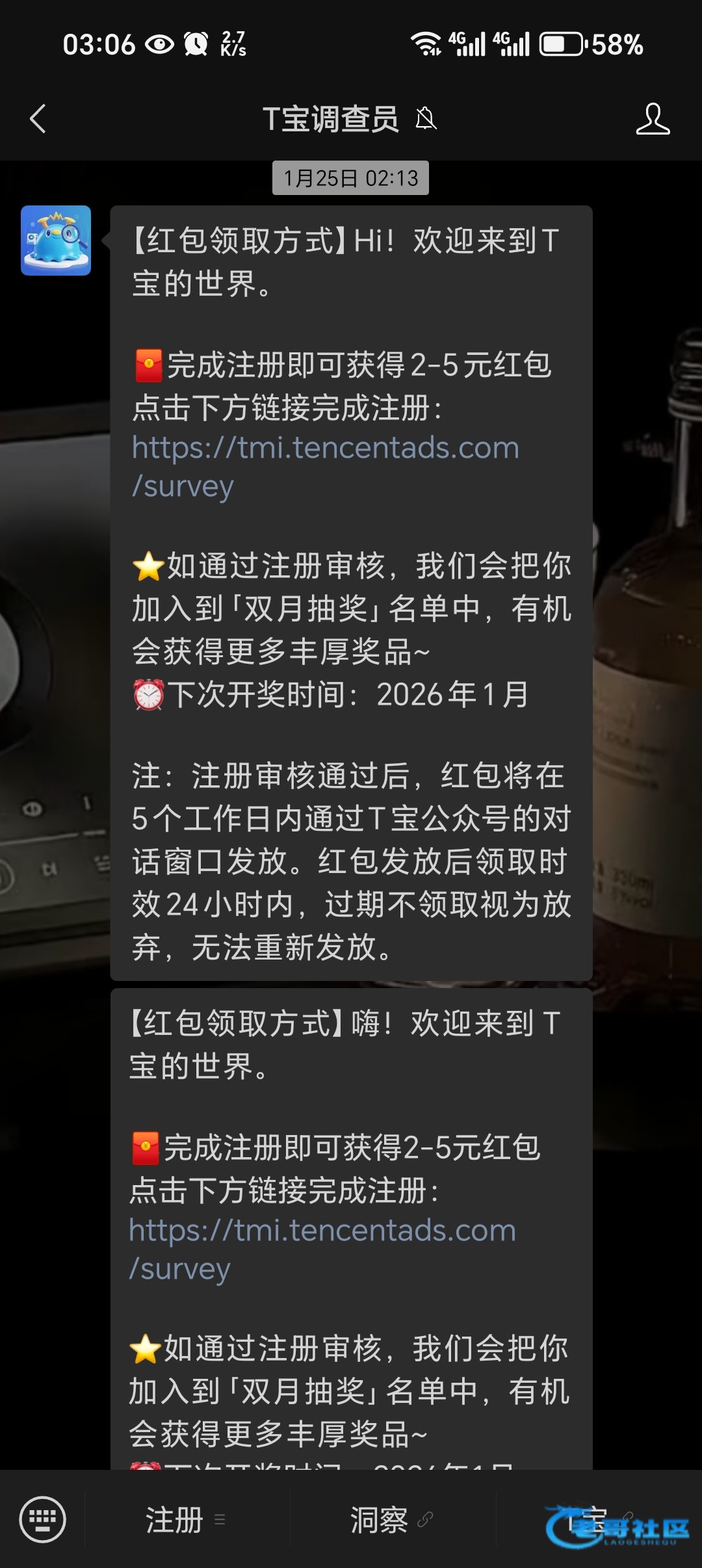 微信搜索小程序T宝调查员进去关注他会给你弹个注册链接里面只需要回答几个问题就可以了1~5天大概就1天多的样子到时候红包会发那个公众号