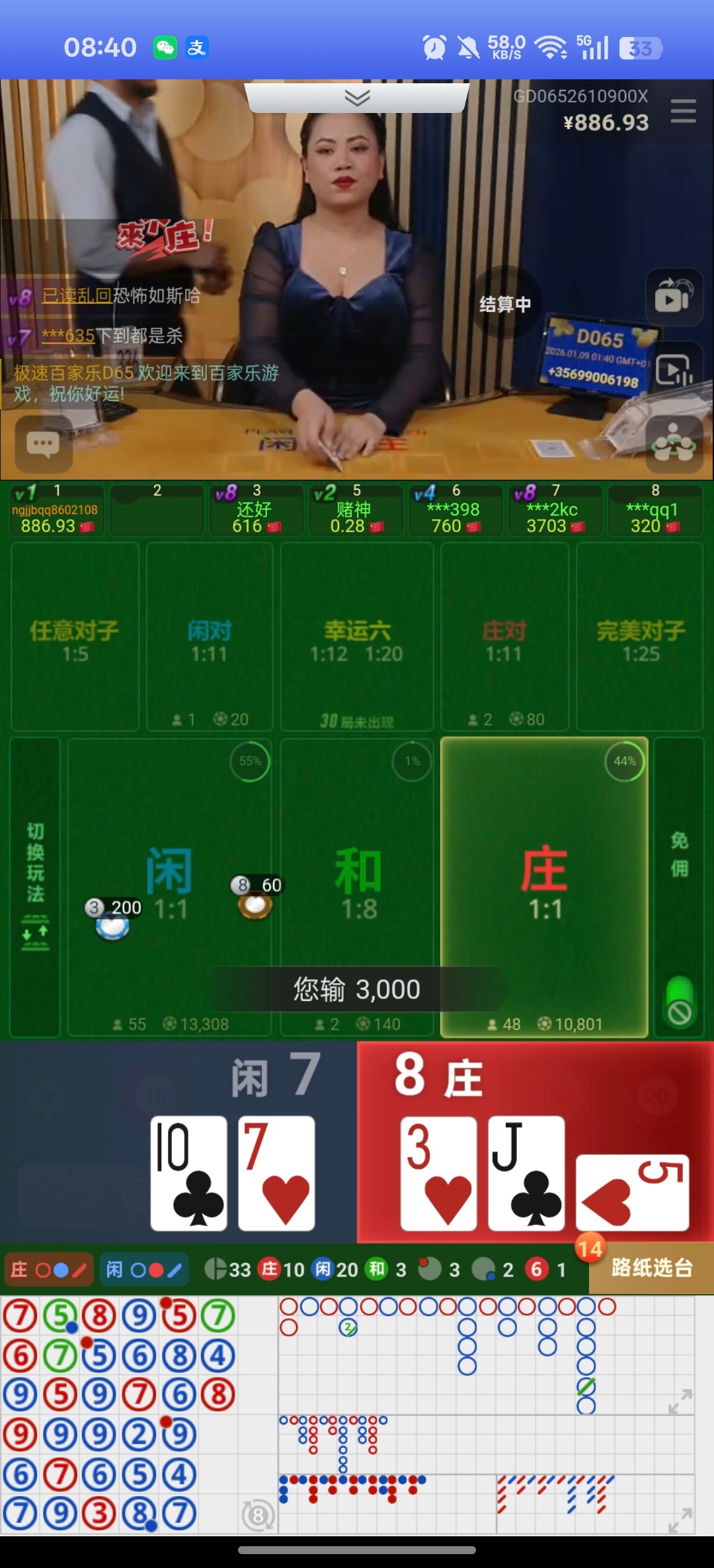 基本上比如我压闲 闲3庄2闲补牌必爆 闲6庄3 庄bu