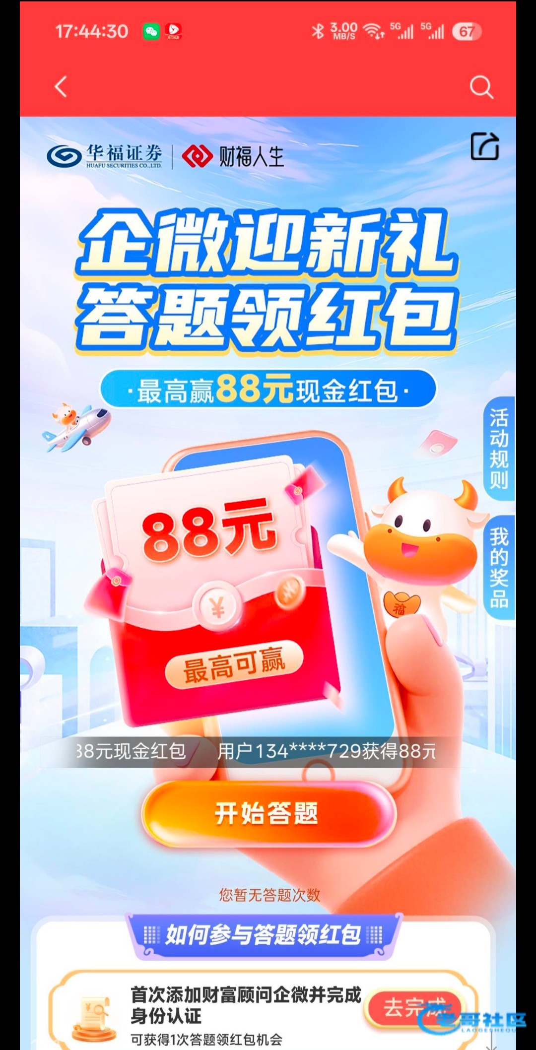 开通过华福证券的老哥微信关注华福证券服务号加客户经理答题,6.8红包可以注销开通换微信无限撸