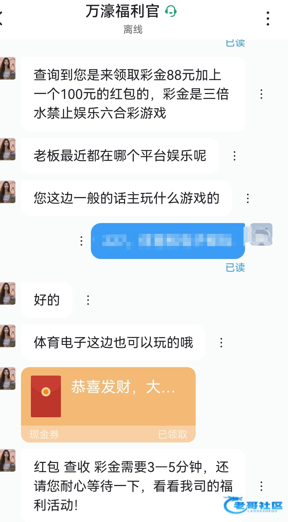 送88+100半夜打个电话让注册联系客服送彩金。5550017.com进去找客服说电话特邀,客服让注册,然后上咖啡领彩金。应该要查电话号码,漏接的可以去试试,碰瓷估计悬,查了两次。