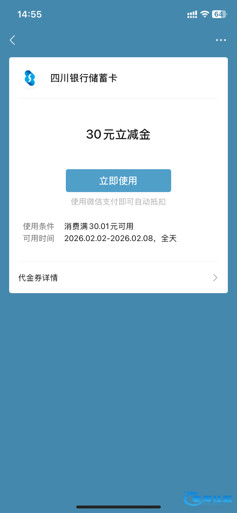 微信小程序搜索四川银行开通一下四川银行二类卡即可,30+立减金绑定就可以使用了。