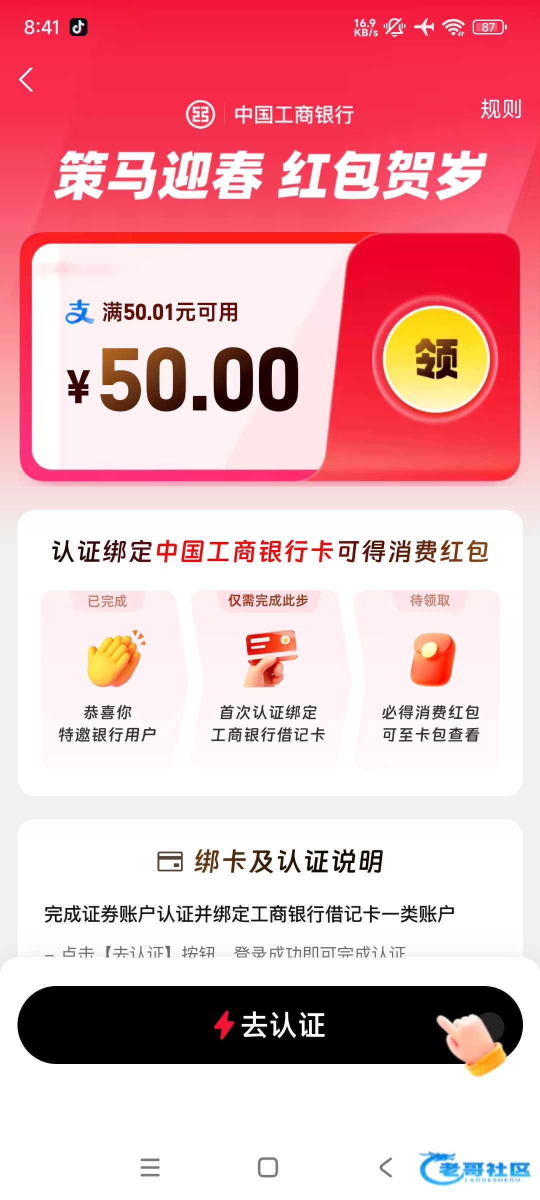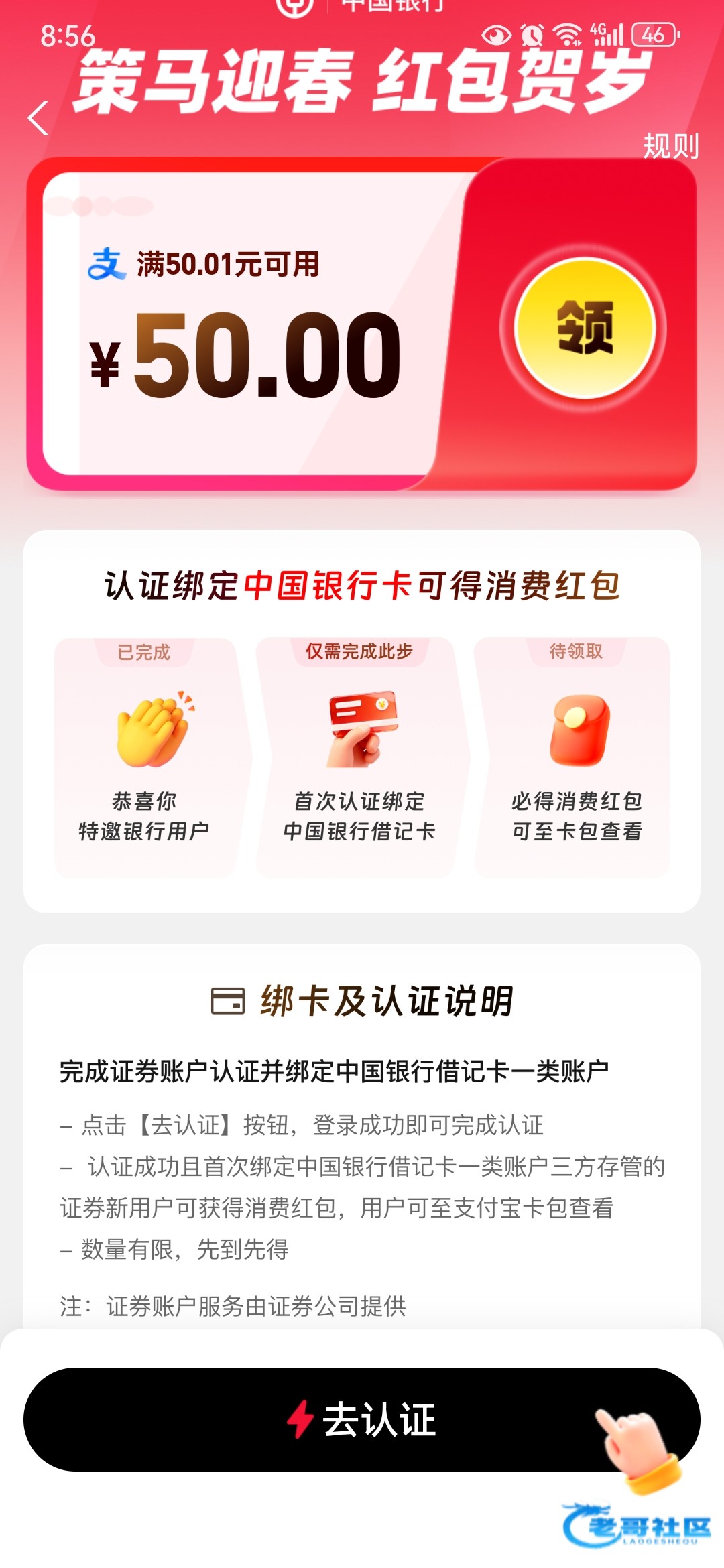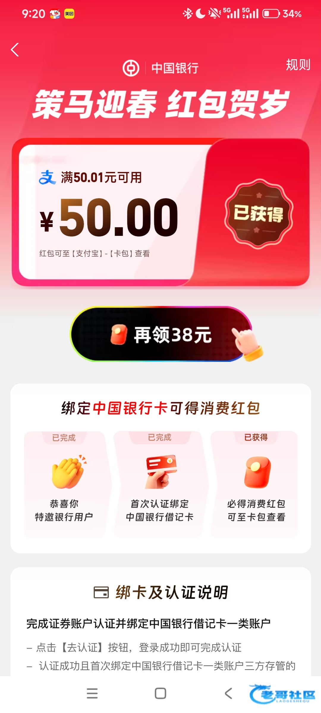绑定中国银行的绑错了。绑成二类卡了。开户一直没成功。但是还有一个绑定交通银行的,50立减金接电话秒开户成。