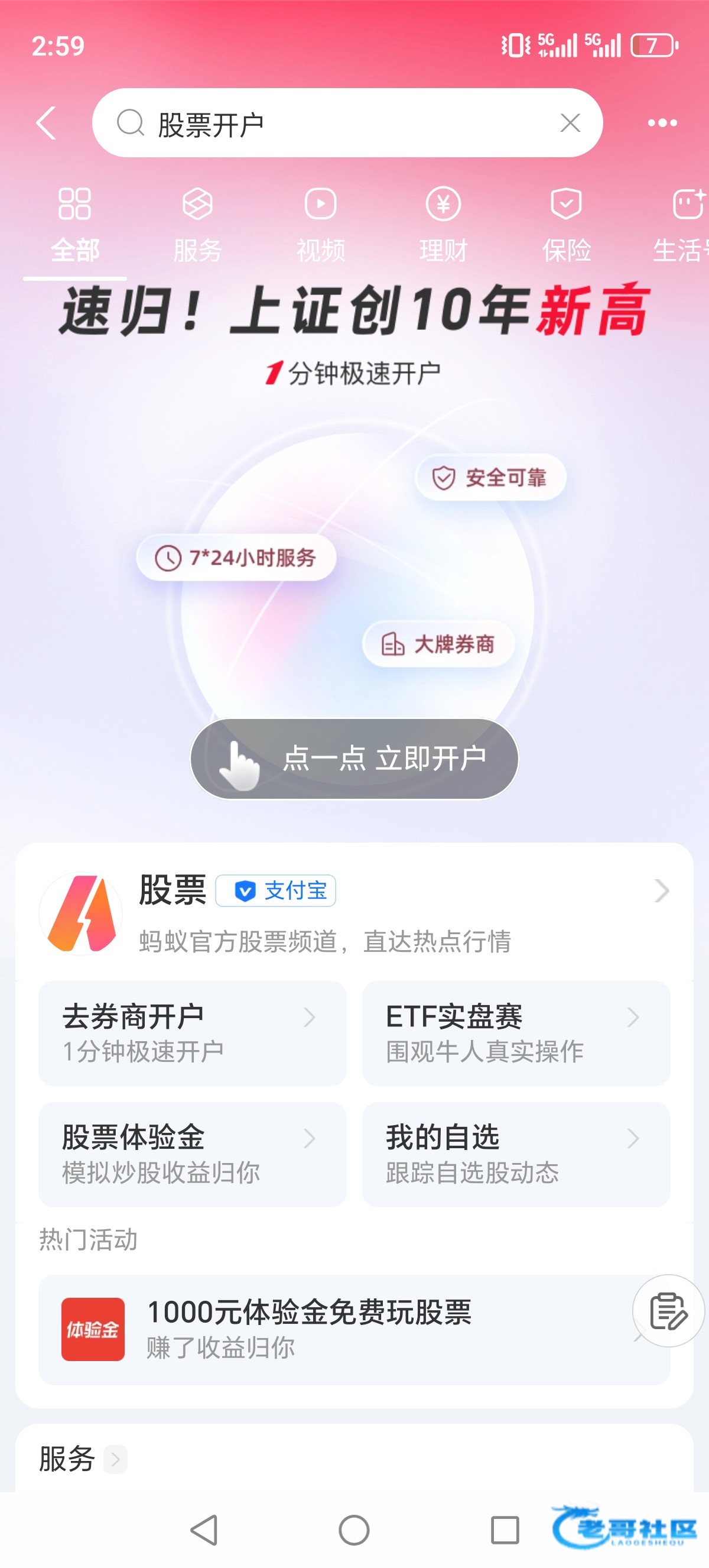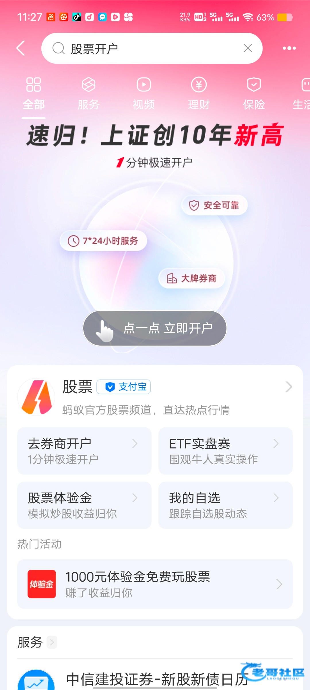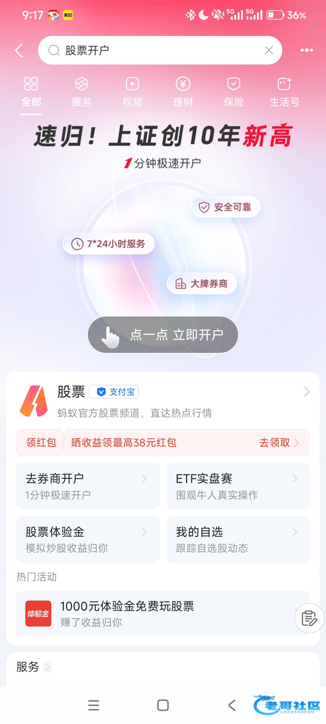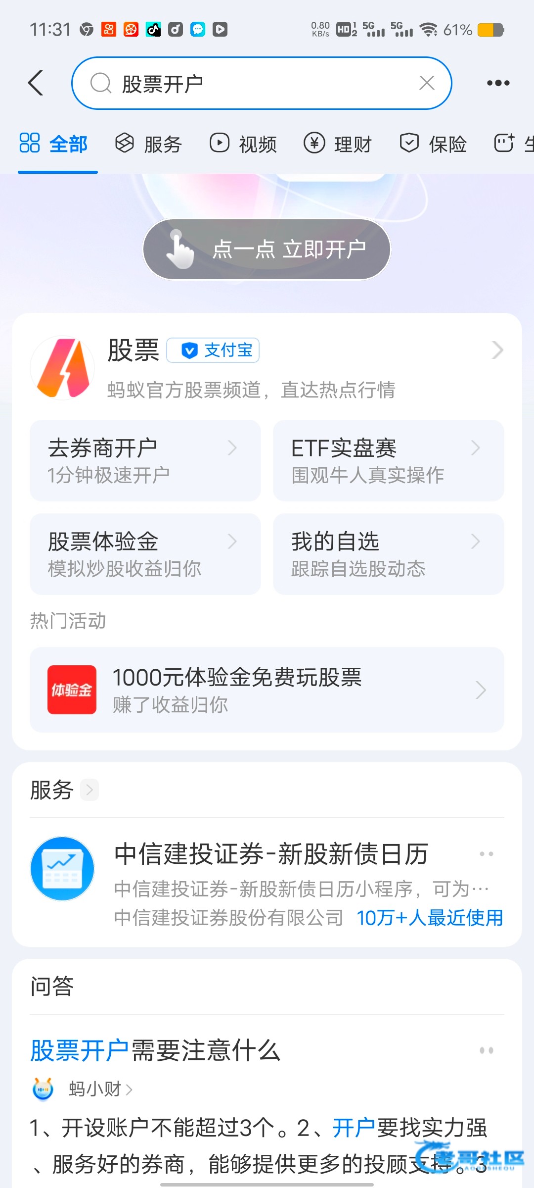 中国银行支付宝中信证券开户50大毛,看图支付宝搜 股票开户 弹图1 入口在下面的红包 进去后就是图二(特邀特邀) 没有图二莫中出我 开户成功后红包直接到卡包了50