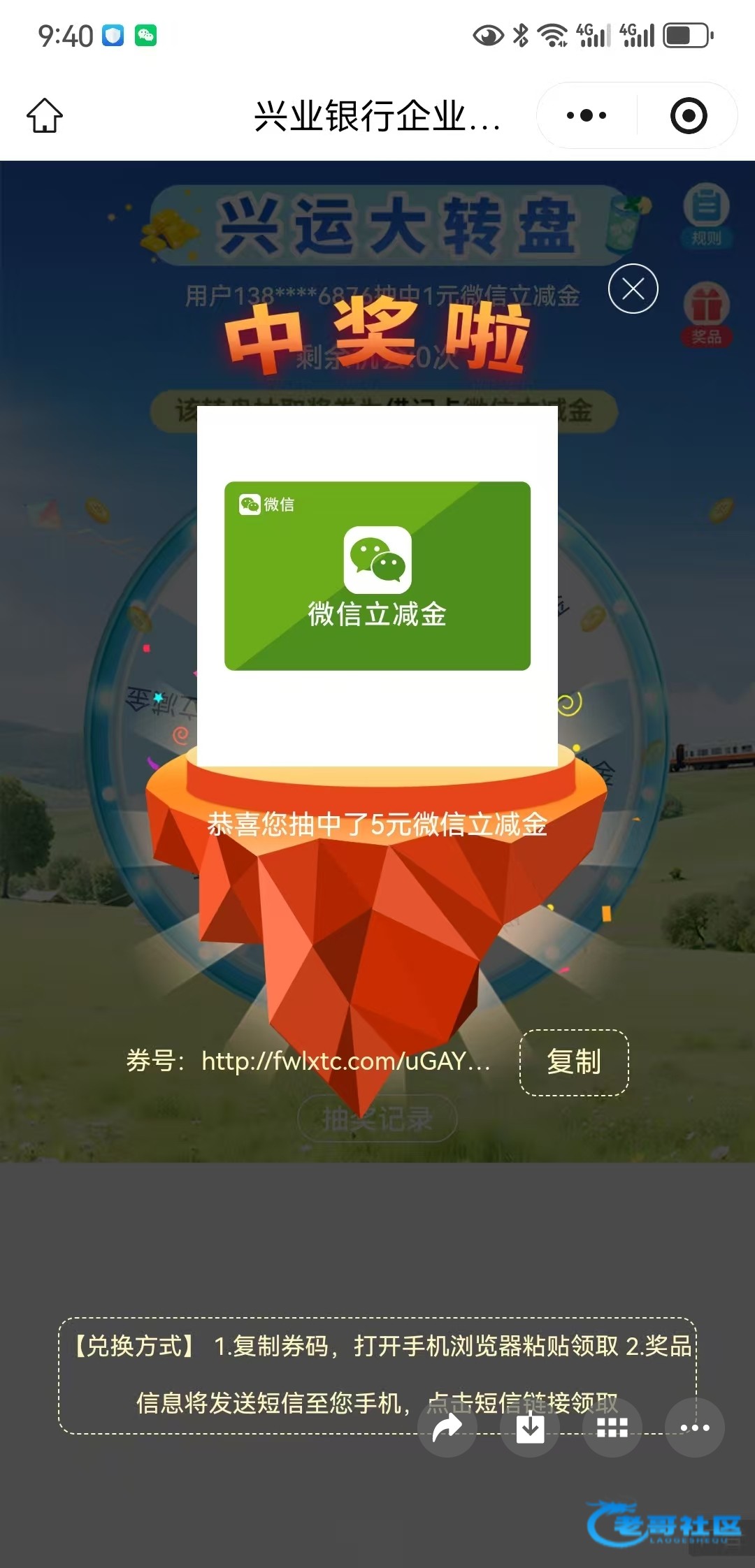 1.加企微抽奖,立减金我知道抽到了五看运气