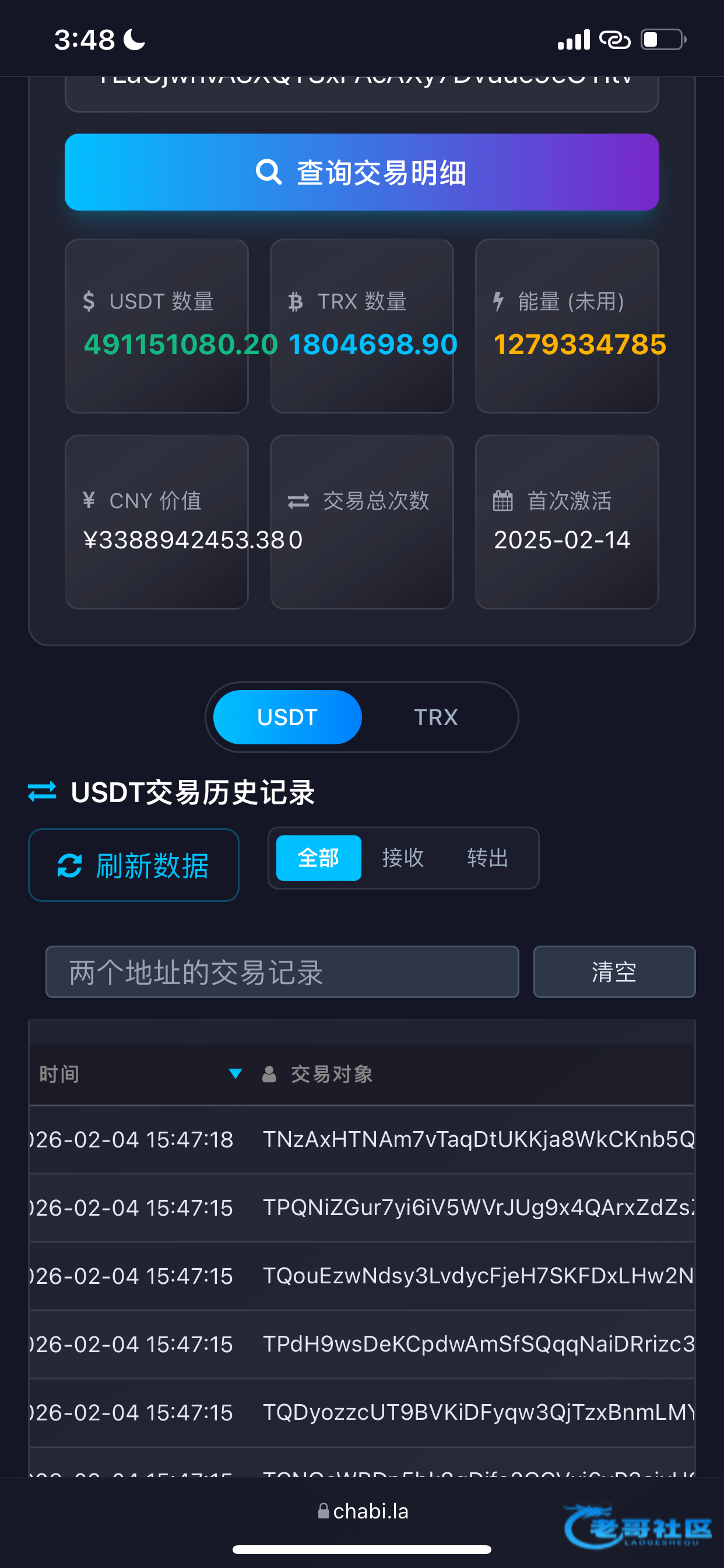 你这种方法太繁琐,告诉你个简单方法 浏览器输入https://chabi.la/tron?address先复制自己的U收款地址,找到狗庄给你汇款的那个明细,在复制狗庄的U地址就能查询狗庄钱包有多少U以及狗庄的历史记录