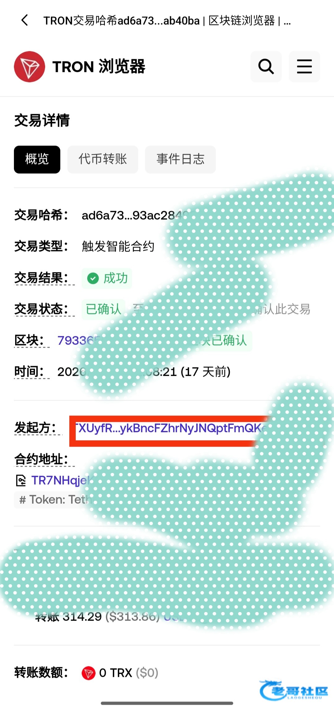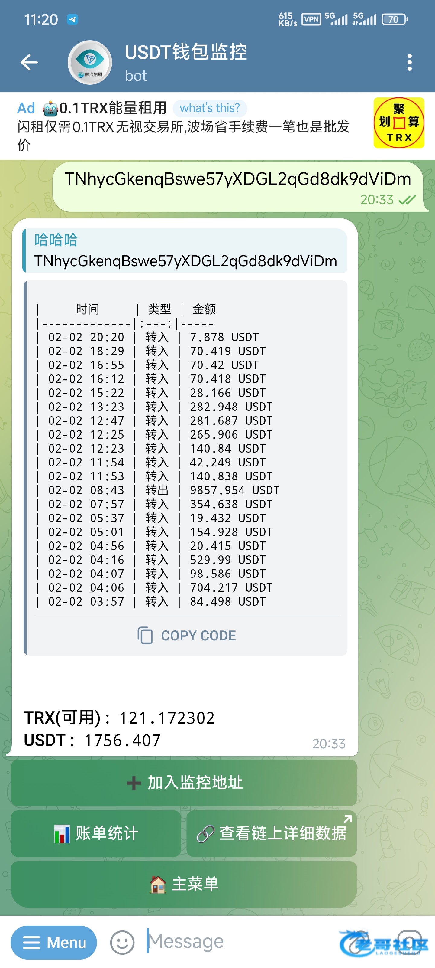 (注意这里的地址是狗庄给你发U地址不是你给狗庄上分收钱那个,基本狗庄收钱和打钱都不一样的,不知道的去找最近一笔狗庄给你打钱的U账单,去区块链上看那个发起方,那个就是 如图)