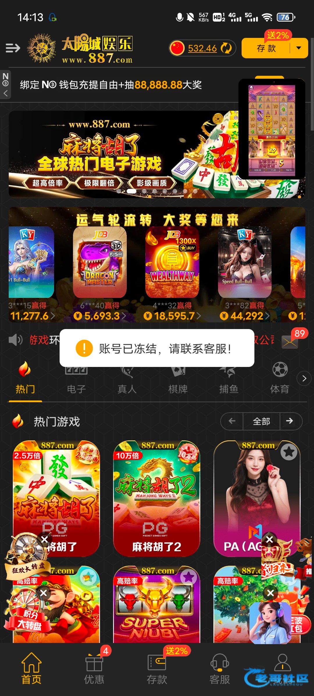 充了500全程打电子,正在打的时候账号冻结,真牛逼,提现被黑我都能勉强接受,这什么都没有,直接黑,我朋友提了近w都没黑,随机黑,在玩的老哥注意点吧,尤其是新注册的老哥
