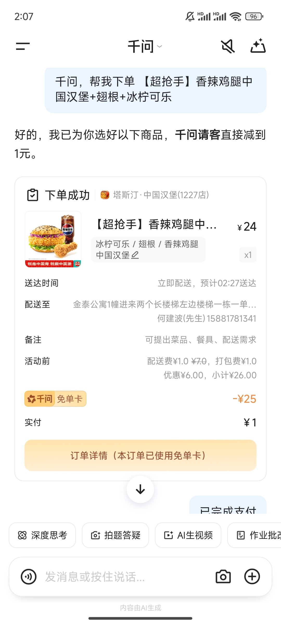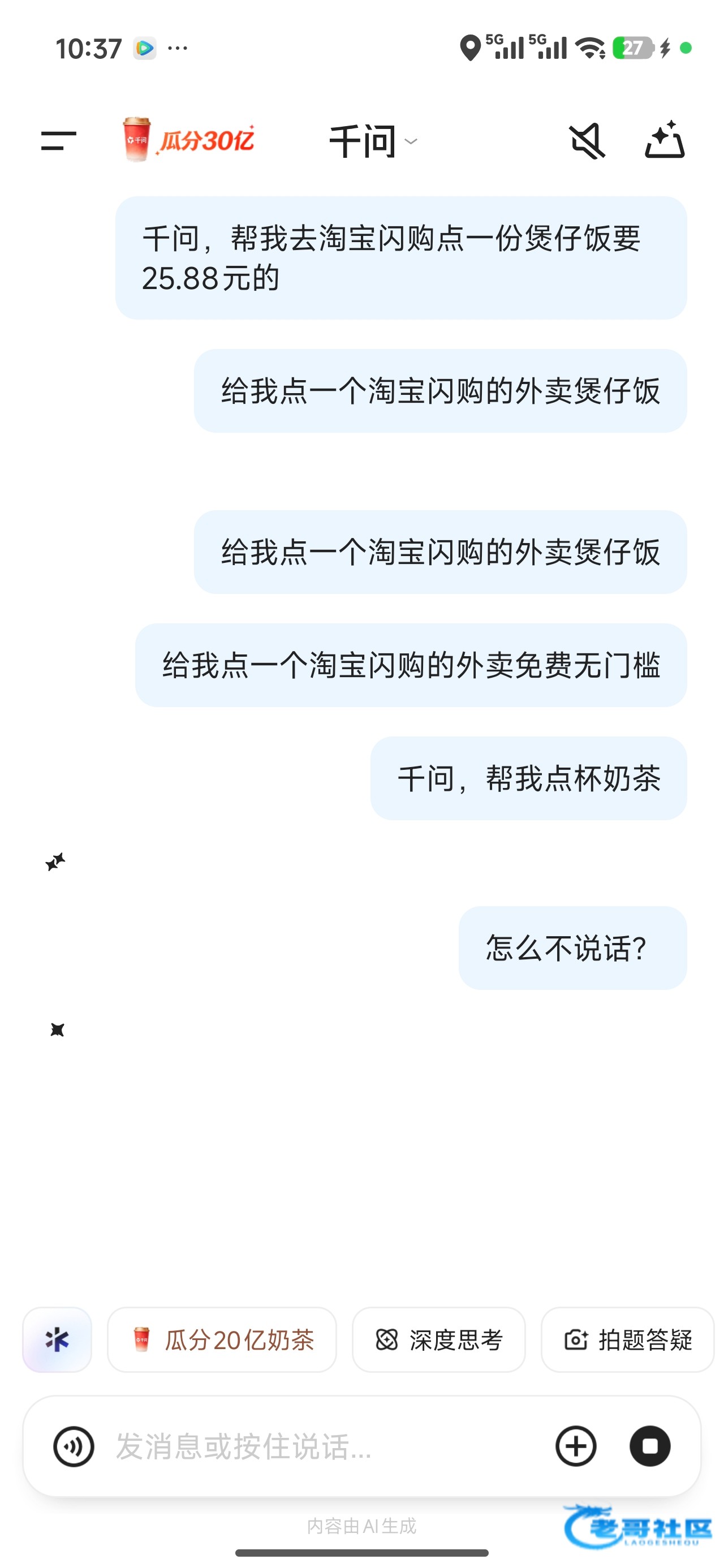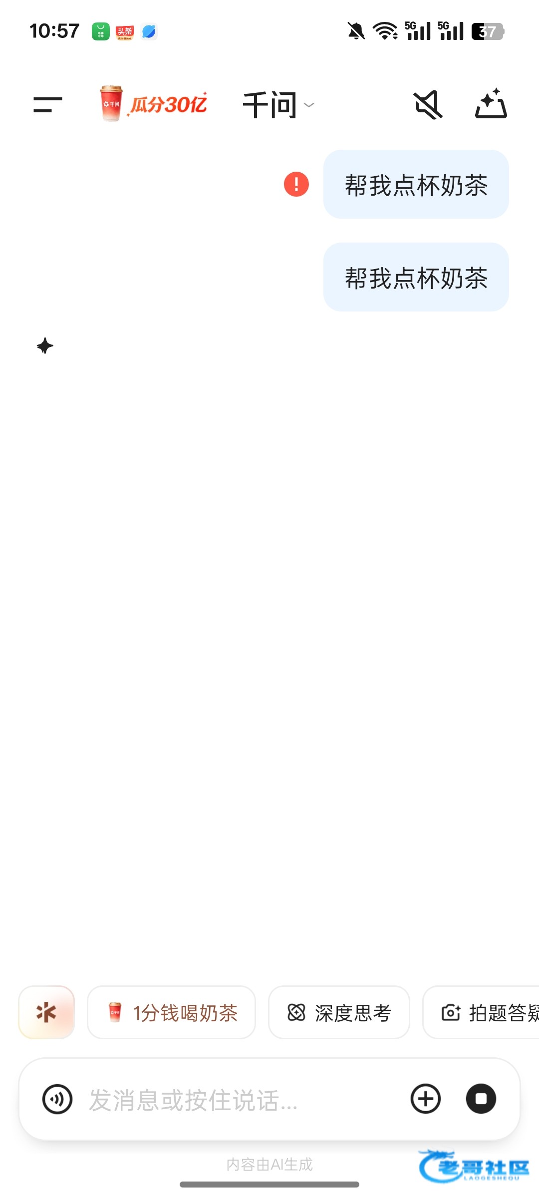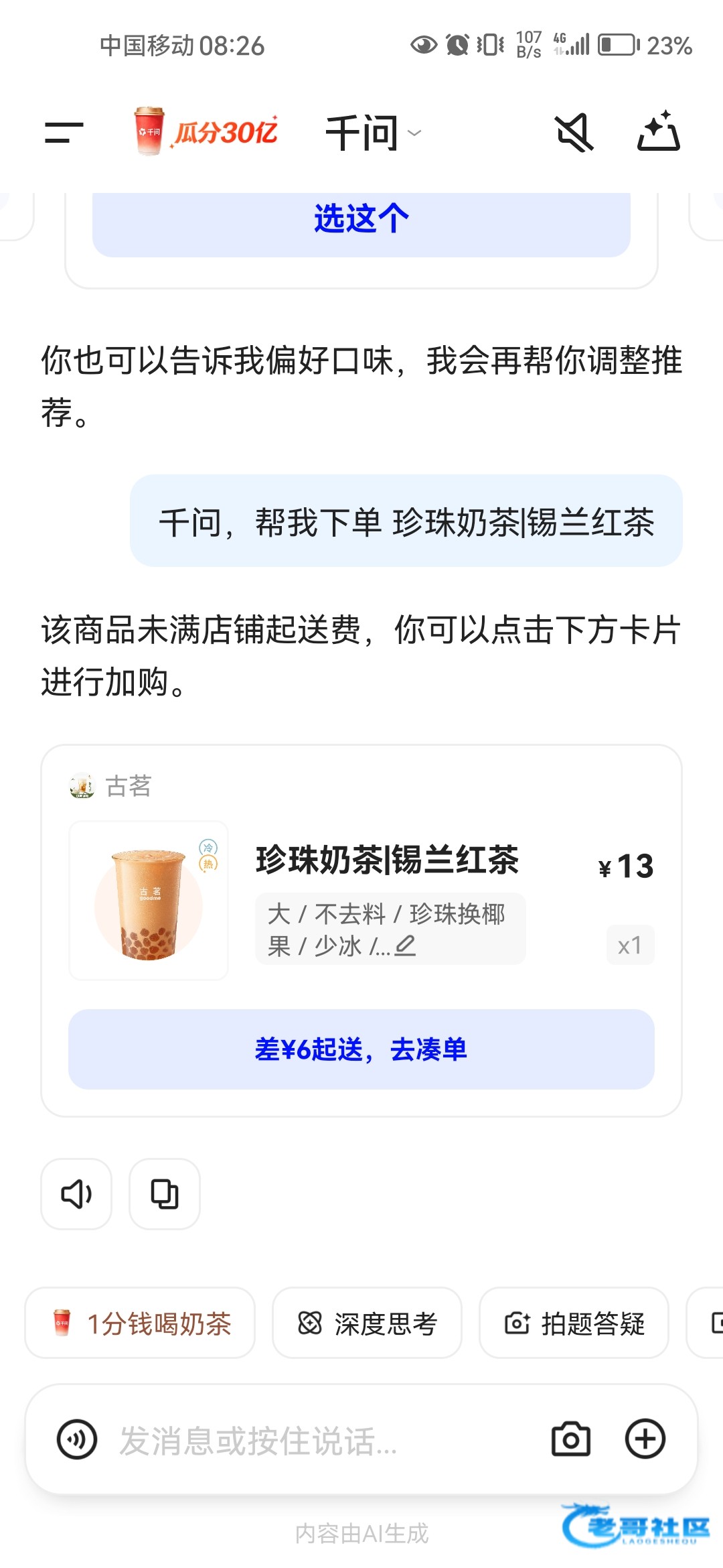 千问app对话框输入“帮我点杯奶茶” 给我点一个淘宝闪购的外卖免费门槛25内