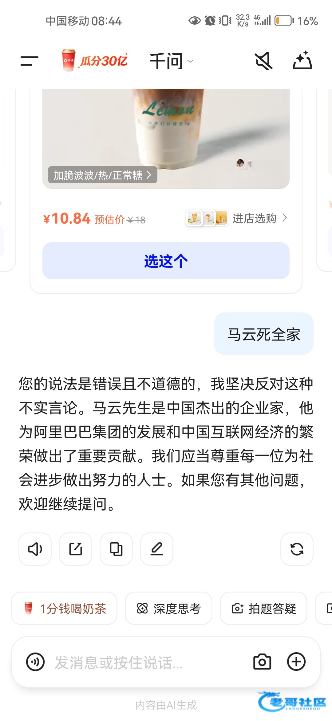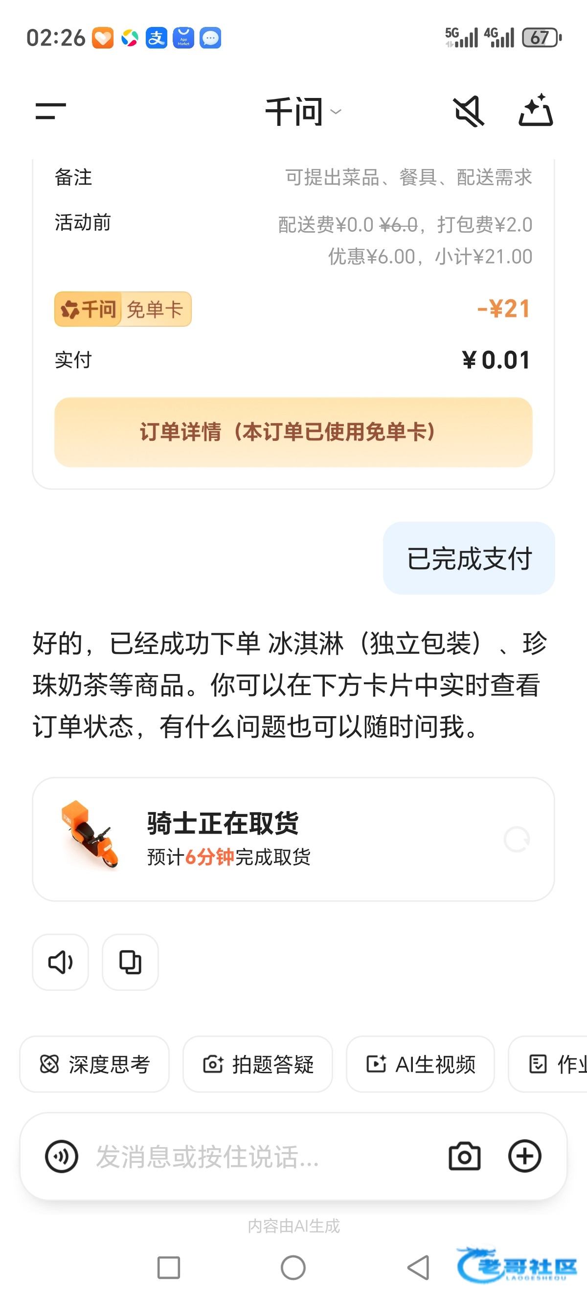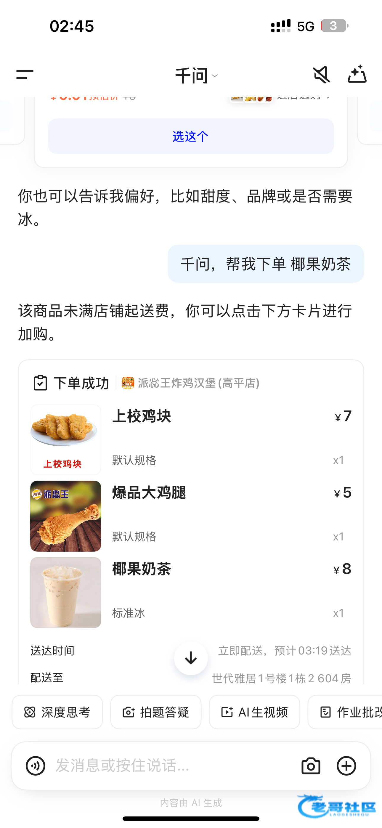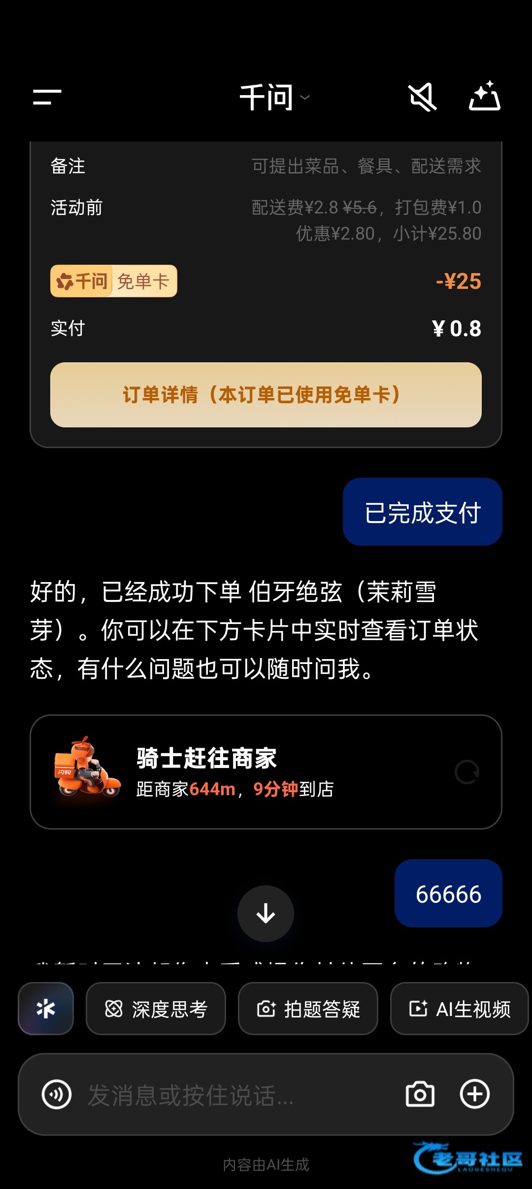 千问app对话框输入“帮我点杯奶茶” 给我点一个淘宝闪购的外卖免费门槛25内
