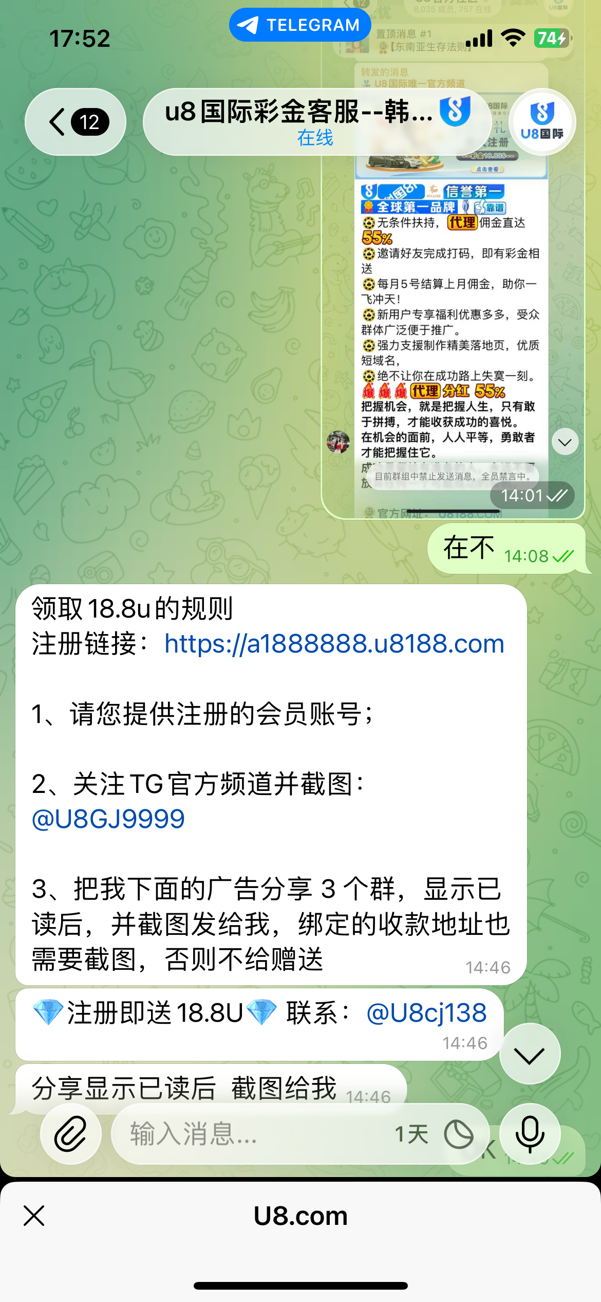 糕手 ▶ 副局 屁吧,去年过年发红包那个是真u8,这个是冒充的。去年过年u8发红包不要流水直接提,几天时间晚上半个小时发一次,最多单次就能抢100u以上,我敢说国内靠它撸几千几万救命钱的人不少,我自己光是抢红包都提了几百u,你提不了只能说你倒霉。 1月前
