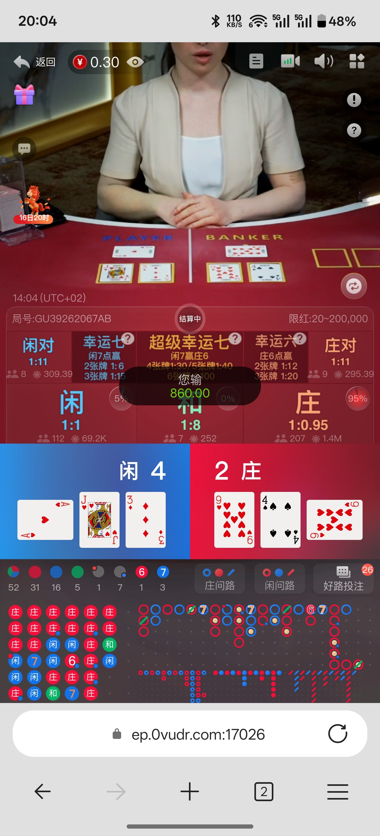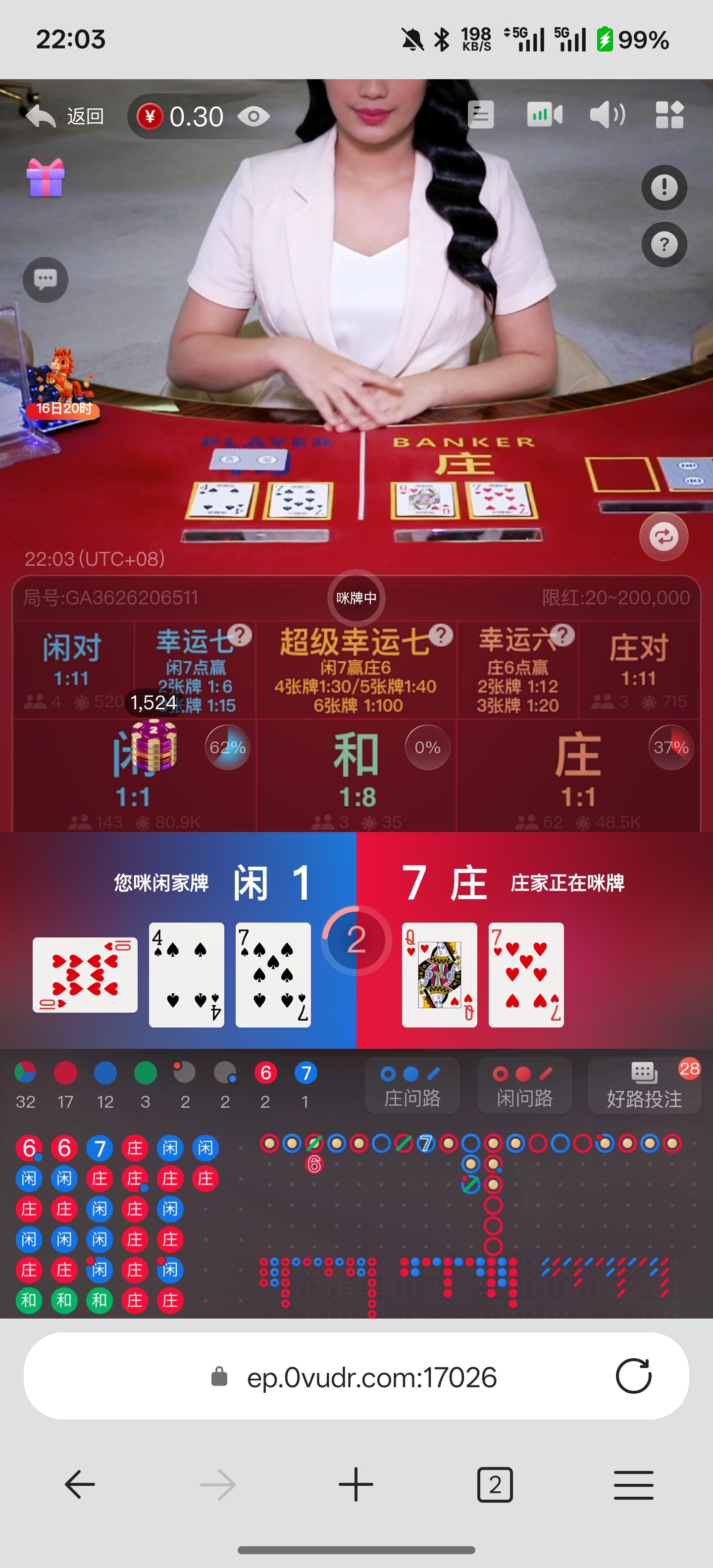 我也是 一玩大就空妈蛋,这个do真人好坑,你买庄他开闲,买闲开庄,你压中那把卡住,你下注成功他就秒你