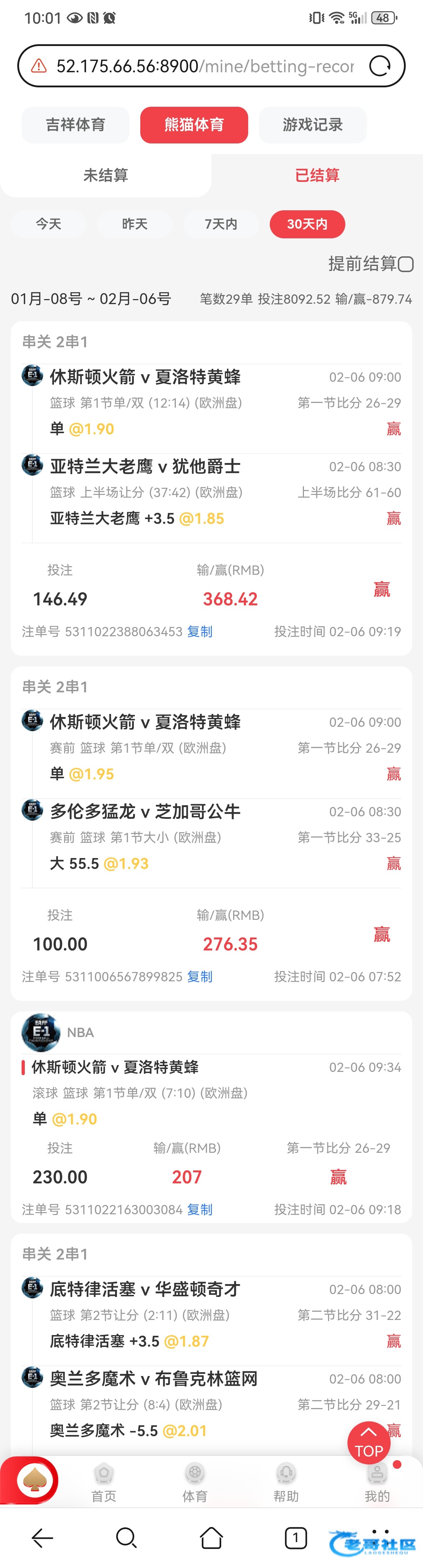 活塞对奇才我也压了 1.06。的赔率活塞独赢。结果奇才赢了。没赢到牛子还倒赔100