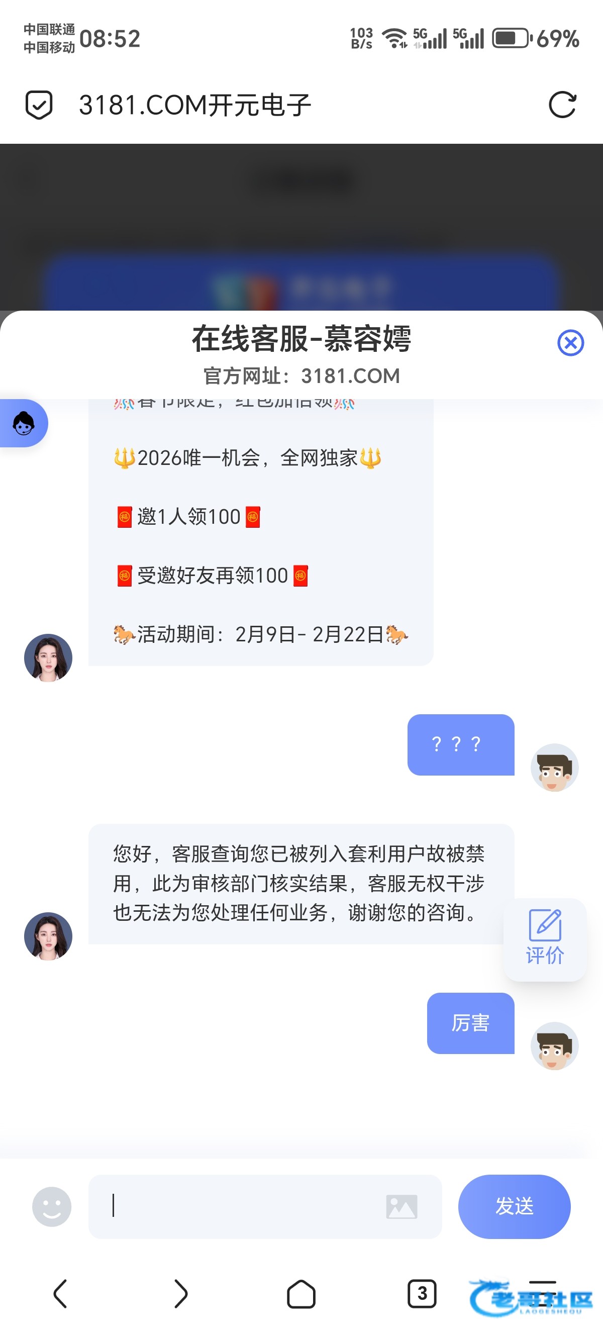 这个系列活动领取了5-6个好像,唯独这个台子下了100。 下了第二天打电话,说存送,没理。就封号了,