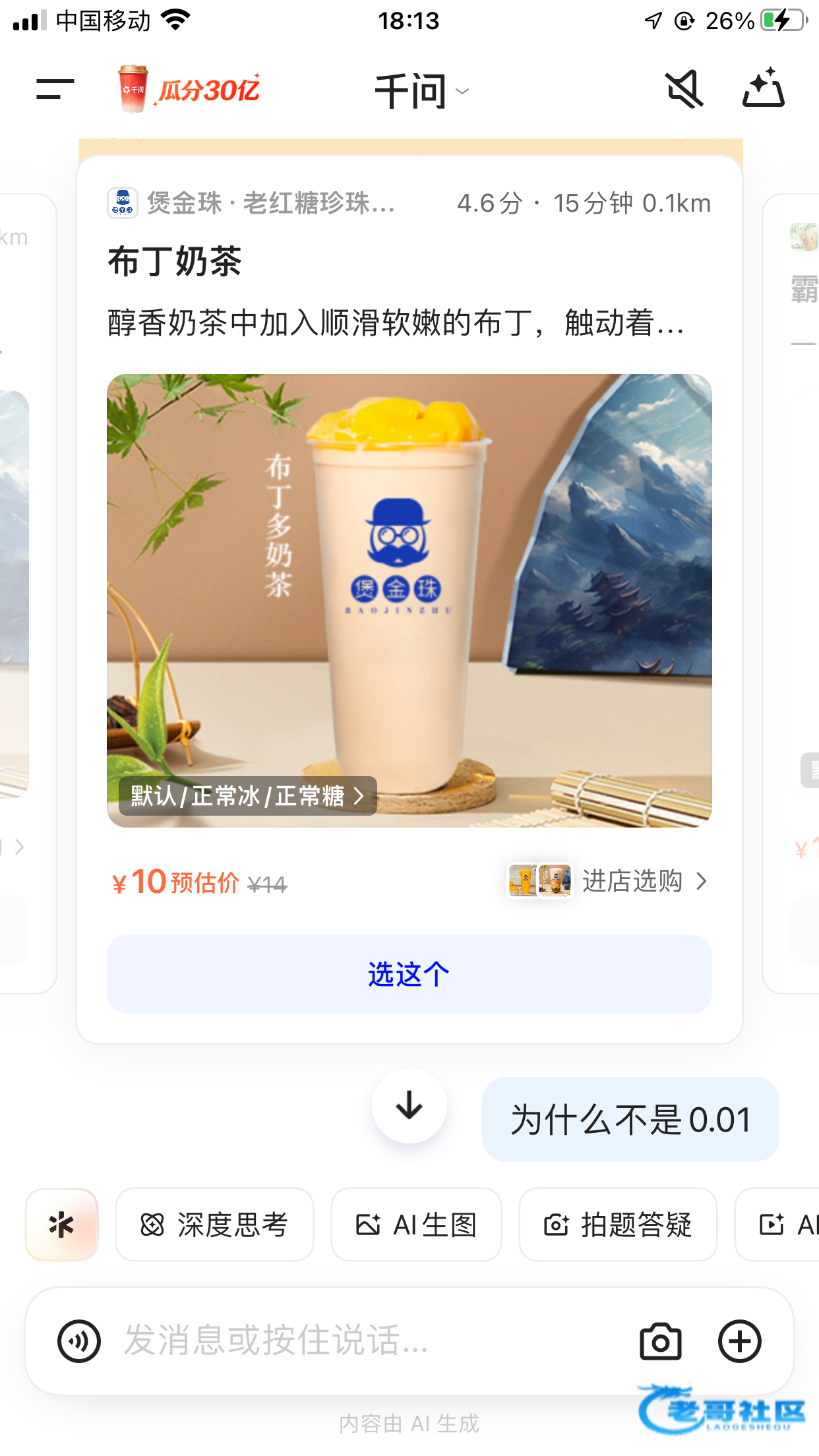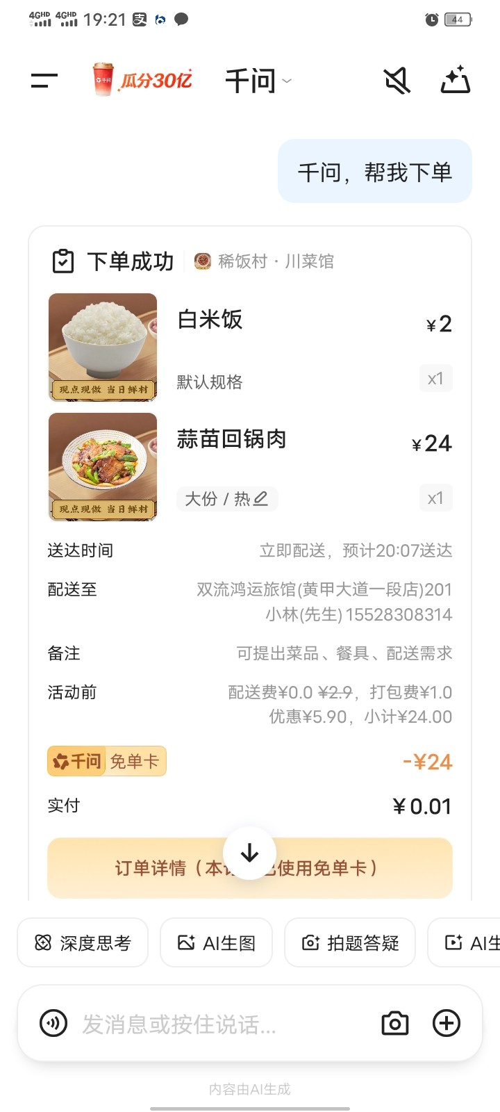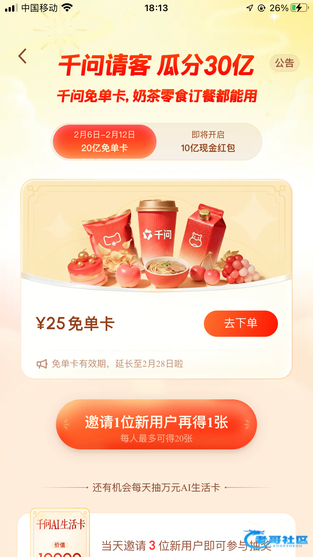 打开定位,不要通过活动页点去下单或者直接发【帮我点奶茶】,而是发【帮我点外卖】,如果一直只提示服务器卡就过15-30分钟再来发。如果有提示人多错峰,运力紧张,这个时候是可以点的,反复开关手机gps定位反复发【帮我点外卖】,就可以卡出点外卖界面了。只要卡出这个界面就一定可以下单成功,除了奶茶千问不会帮你弄成0.01的,自己点进店选购点25上下的就可以了,同理反复下单多点几次就能成功另外有两个小技巧,一个是挑人少的时候,比如早上凌晨,晚上深夜给千问发【帮我点外卖】提前呼出点外卖界面,等你饭点要吃的时候可以直接通过外卖界面点单。第二个是有的挂壁老哥比如我用不了支付宝,而千问是默认绑定支付宝支付的,没关系,你千问提交订单成功后可以在淘宝 待支付 订单里用微信支付。最后希望大家都能得吃。