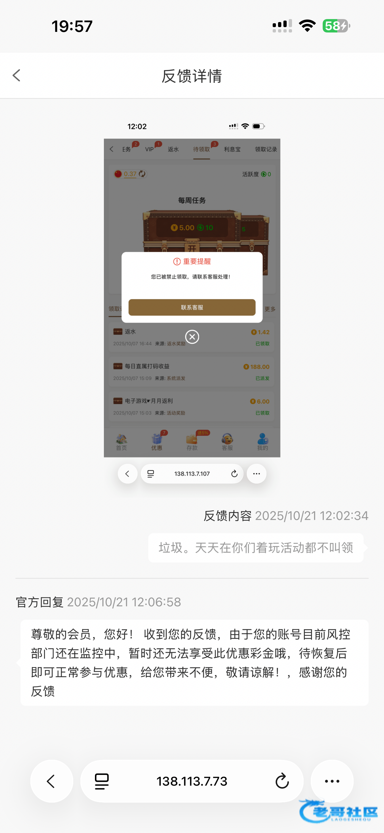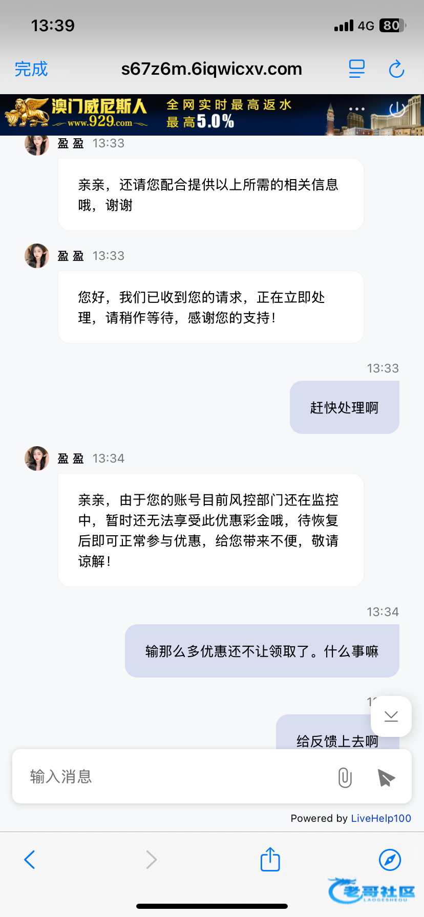 从开始到现在玩了近一年了。近期一直输可以说压根没赢过这个平台。就前几天开始封了所有优惠不知道为啥。问客服客服说系统监控。这玩意说出来我咋一头雾水。都v6了。赢了风控没得说。可他妈我近几天一直输还封我优惠。反水啥jb都没有了。我说问问老哥啥情况能不能继续我联系不上老哥。 在做各位老哥探讨一下这玩意儿还能不能继续。这台要不要换个。