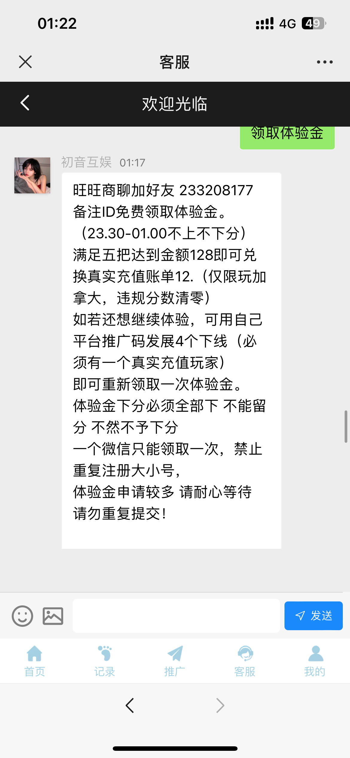 别去打,之前那个老版本初音,好不容易打了十几个号,把账单12.8的条件达到 30+余额和五把下注,找客服回43 说了半天就回我一个体验金只能回12.8哟,我质问了半天,要么就是故意不回你消息,要么就是说只能下12.8 好 那我就将就下12.8 发了zfb码子给他就跟死人一样不回你, 本来28上128 然后12.8又要上就难,还不给出 ,垃圾平台,我还问了旺旺,解决方式也没有,就是一句你朋友得罪客服了吧,我一句骂人的话都没说过,顶了天就是质问他为什么12.8真实账单不能全下,垃圾平台