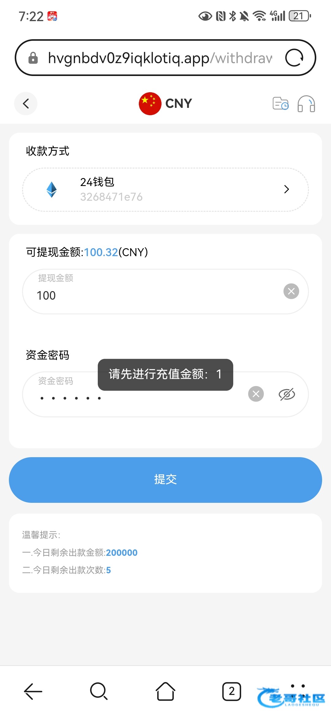 提180到账了,限制提现24钱包,搞半天才搞好