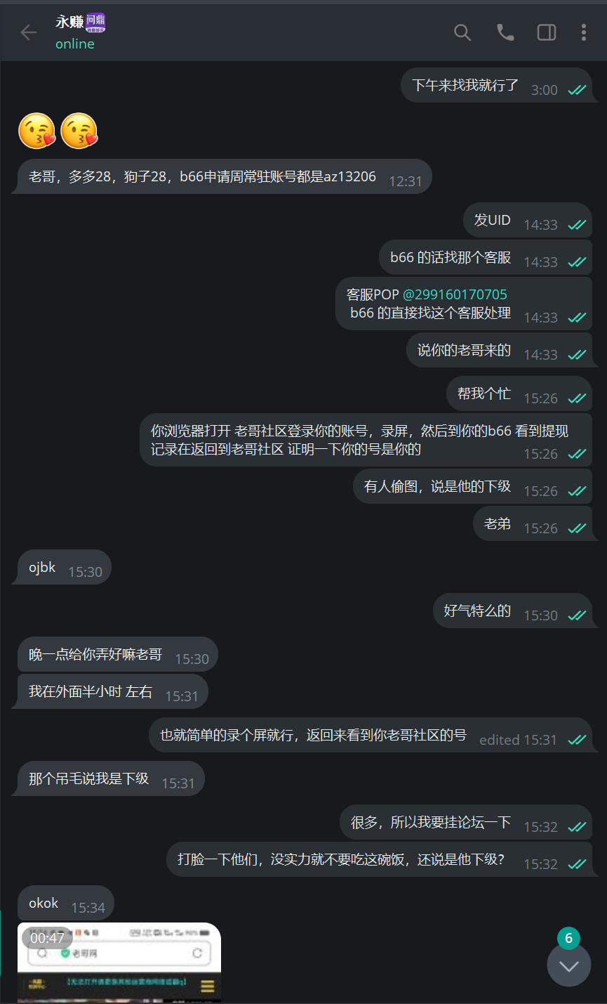 近期收到很多老哥们跟我反馈,关于 B66 32W的那个,很多狗推盗图,反咬一口说是他下级?,本来是不想管的,狗推混口饭吃也能理解,32w 也不算太大额,但是被反咬一口说是他下级,我盗他图的,就很无语,在此声明,这不是我这边第一次出大额的时候,50-80w 在问鼎 或我担保的其他台子也出过,只不过我没喊那些老哥发贴而已,也没必要团是心意不是本分