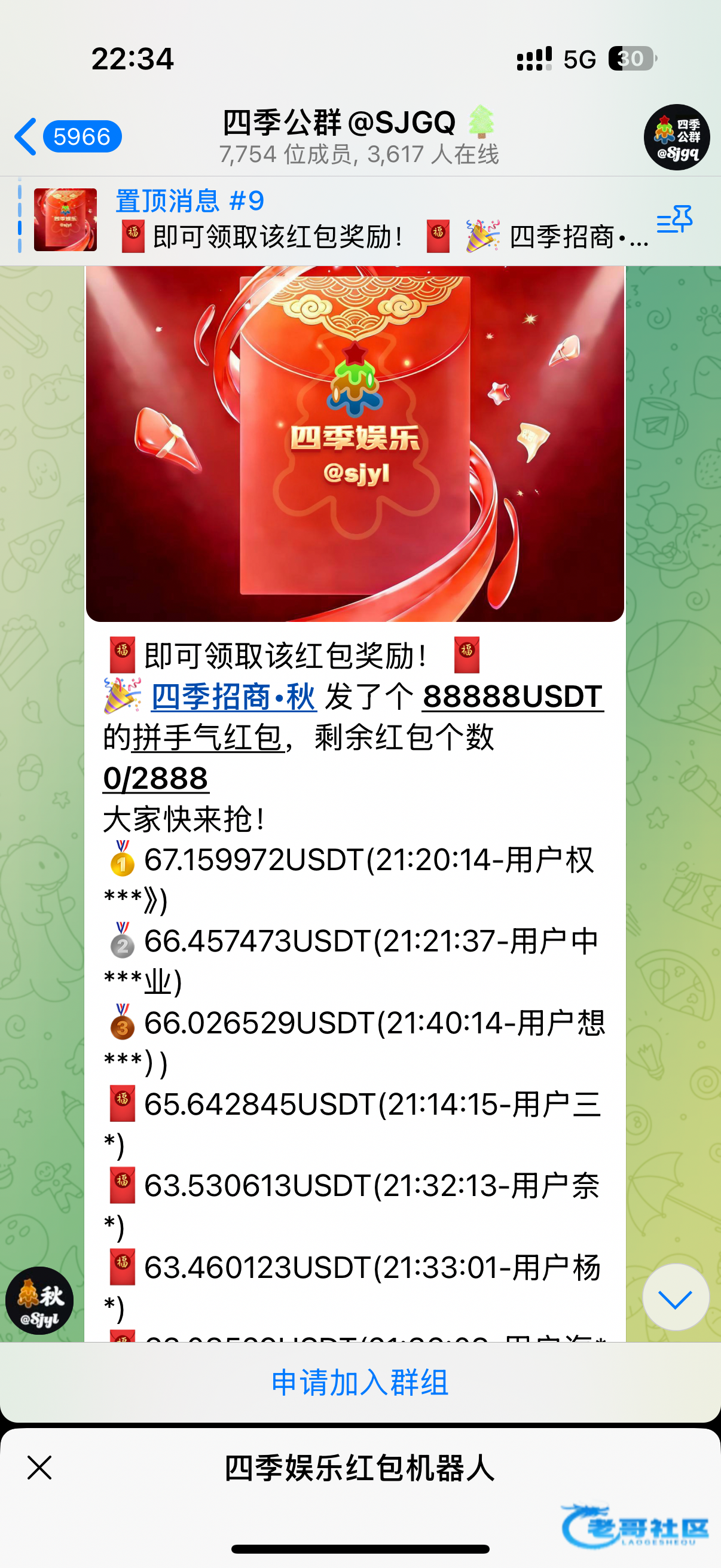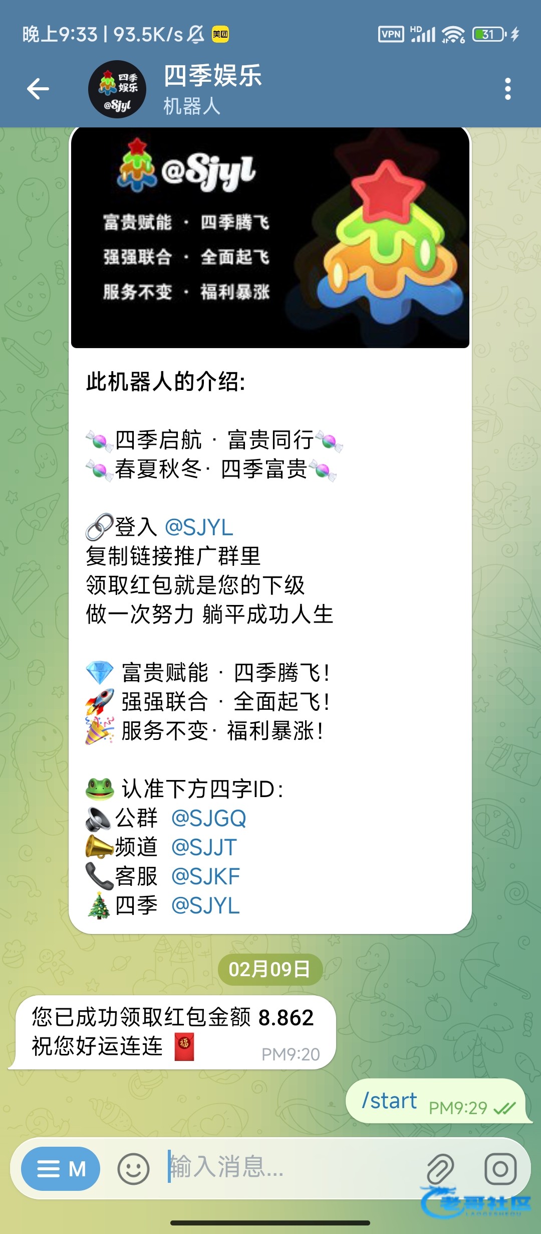 搜索@SJGQ领,先注册机器人,再领红包,不用进群也能领,现在很卡,抢红包要有耐心,领的是u,还有一千个包