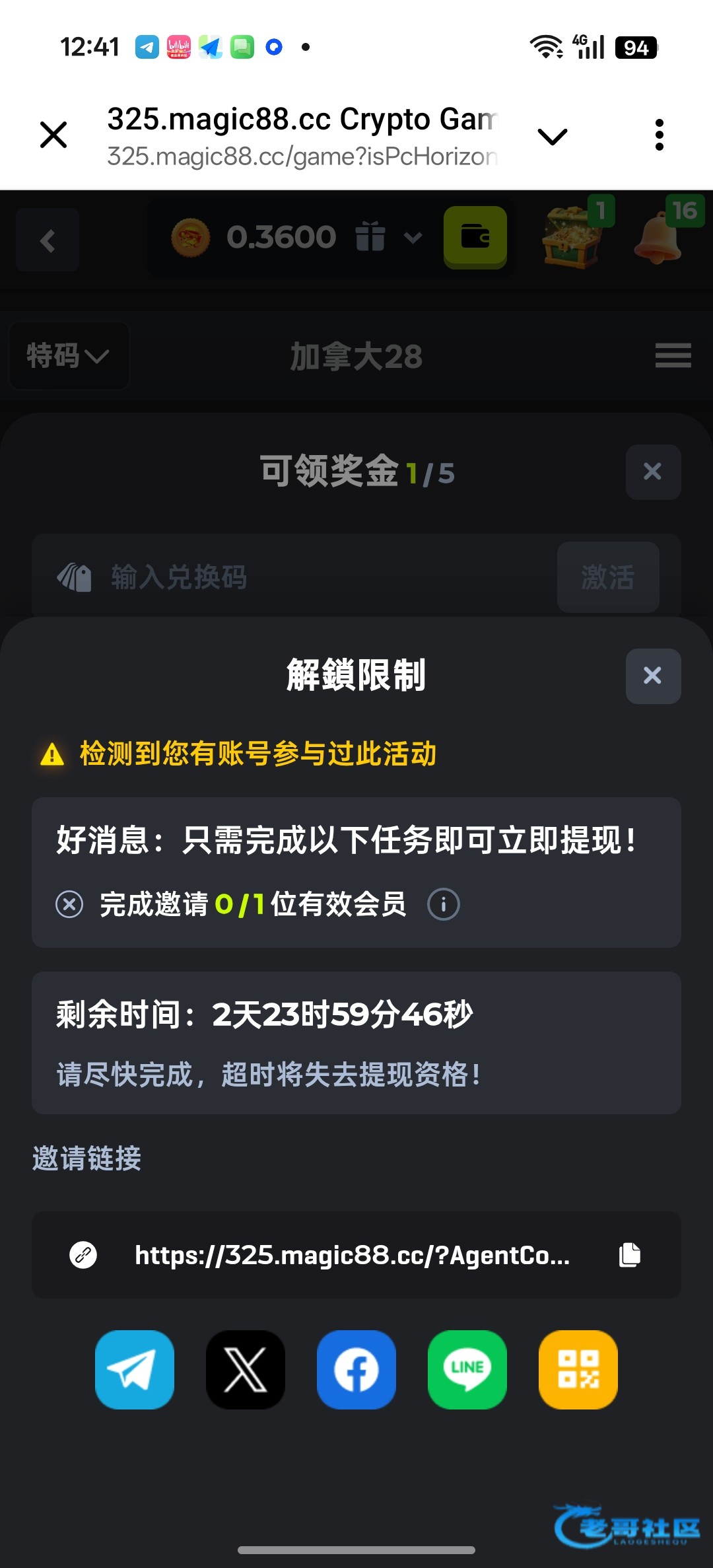 妈的解锁后说我有账号参加过了?需要拉一个人充值一百u。假的。妈的,去年跟这个一模一样的撸过一次提了几十u,但不是这个飞机号。