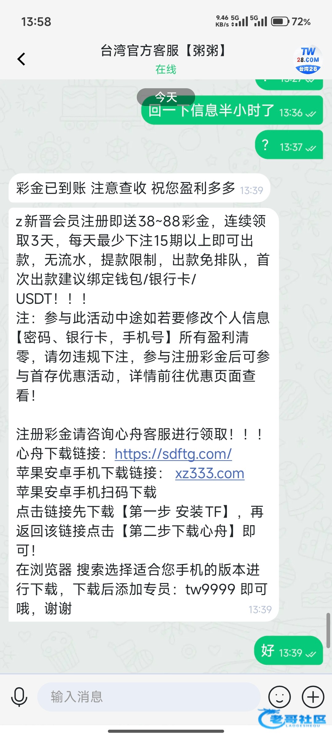 新晋会员注册即送38~88彩金,连续领取3天,每天最少下注15期以上即可出款,无流水,提款限制,出款免排队,首次出款建议绑定钱包/银行卡/USDT!!!注:参与此活动中途如若要修改个人信息【密码、银行卡,手机号】所有盈利清零,请勿违规下注,参与注册彩金后可参与首存优惠活动,详情前往优惠页面查看!注册彩金请咨询心舟客服进行领取!!!心舟下载链接:https://sdftg.com/苹果安卓手机下载链接: xz333.com苹果安卓手机扫码下载点击链接先下载【第一步 安装TF】,再返回该链接点击【第二步下载心舟】即可!在浏览器 搜索选择适合您手机的版本进行下载,下载后添加专员:tw9999 即可哦,谢谢