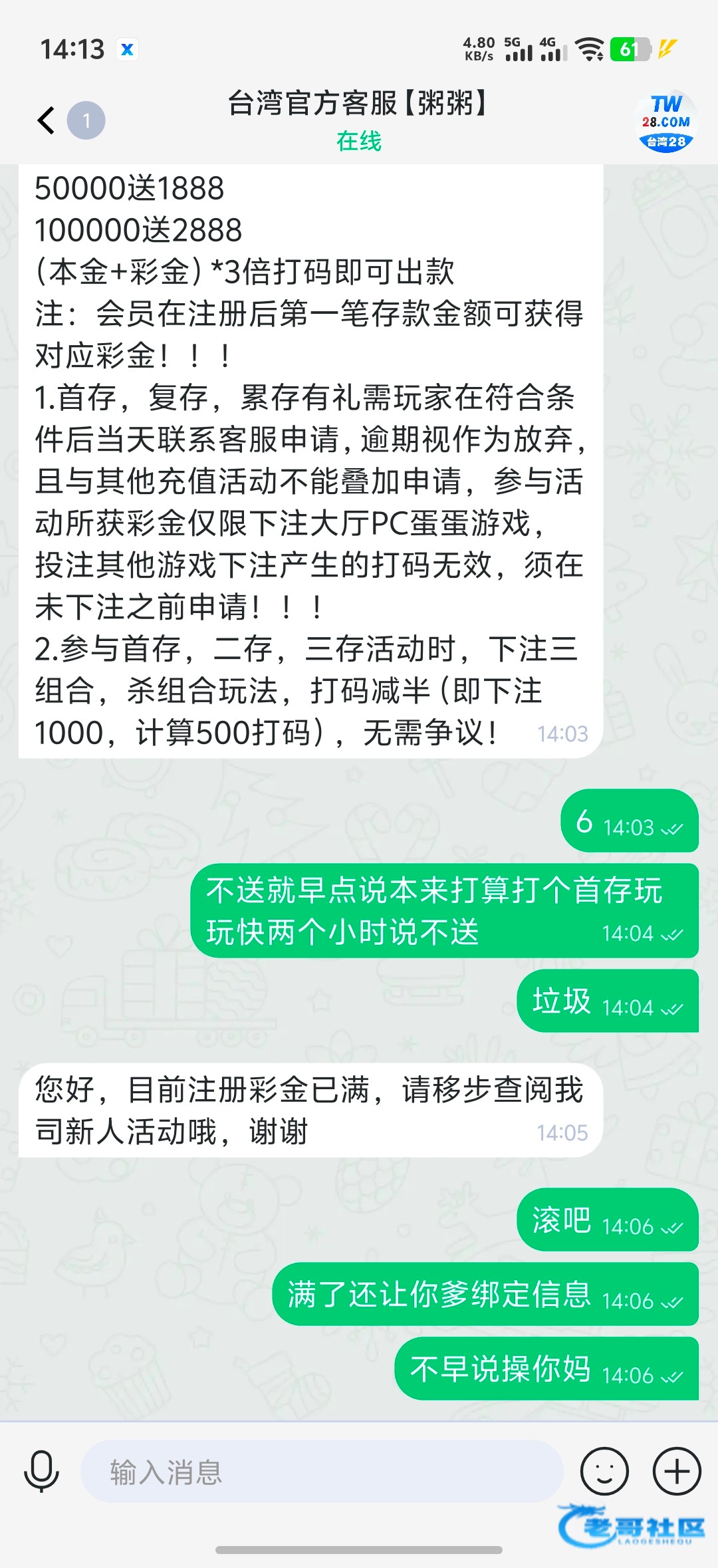 黑台一个 500送188打到6000就单压说我违规不给下