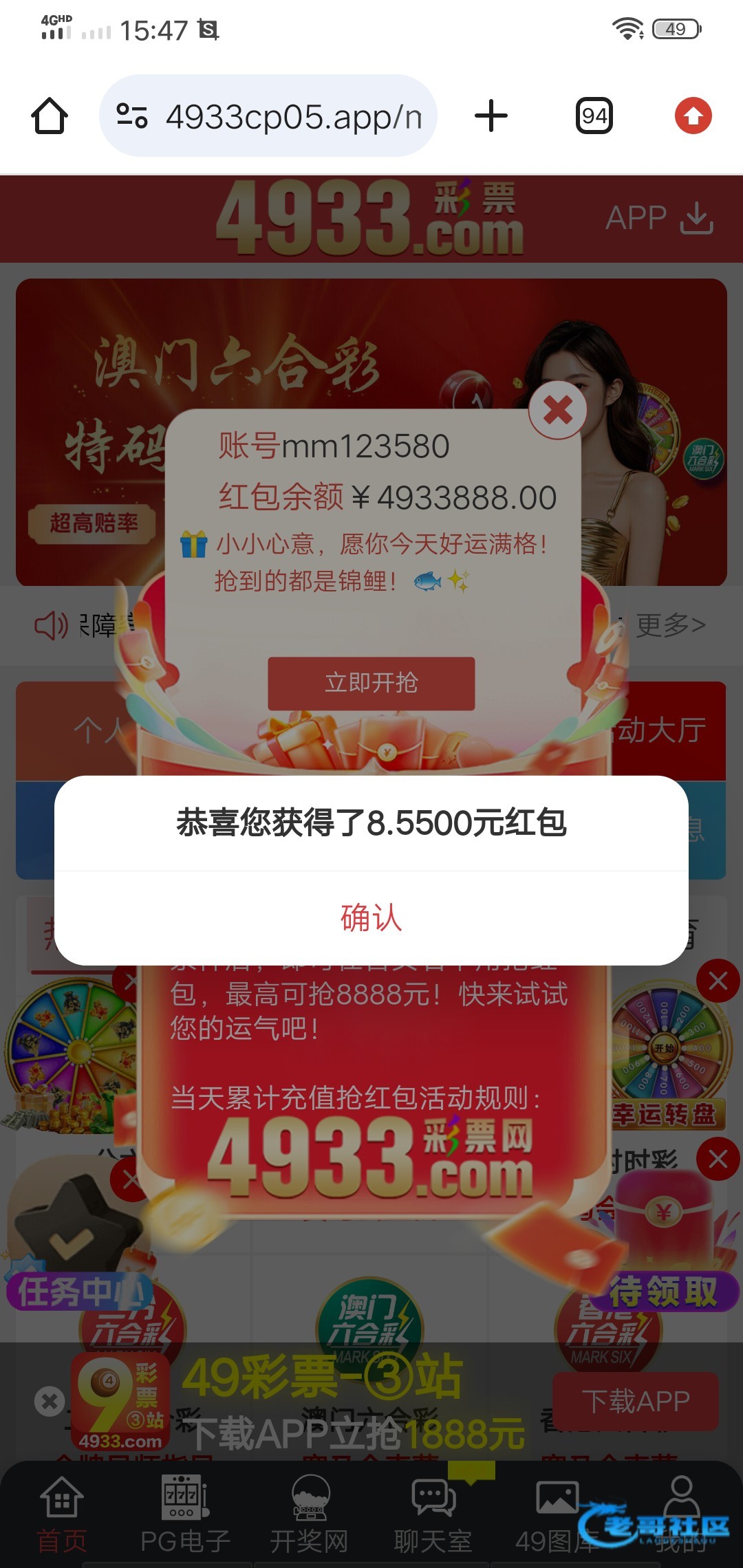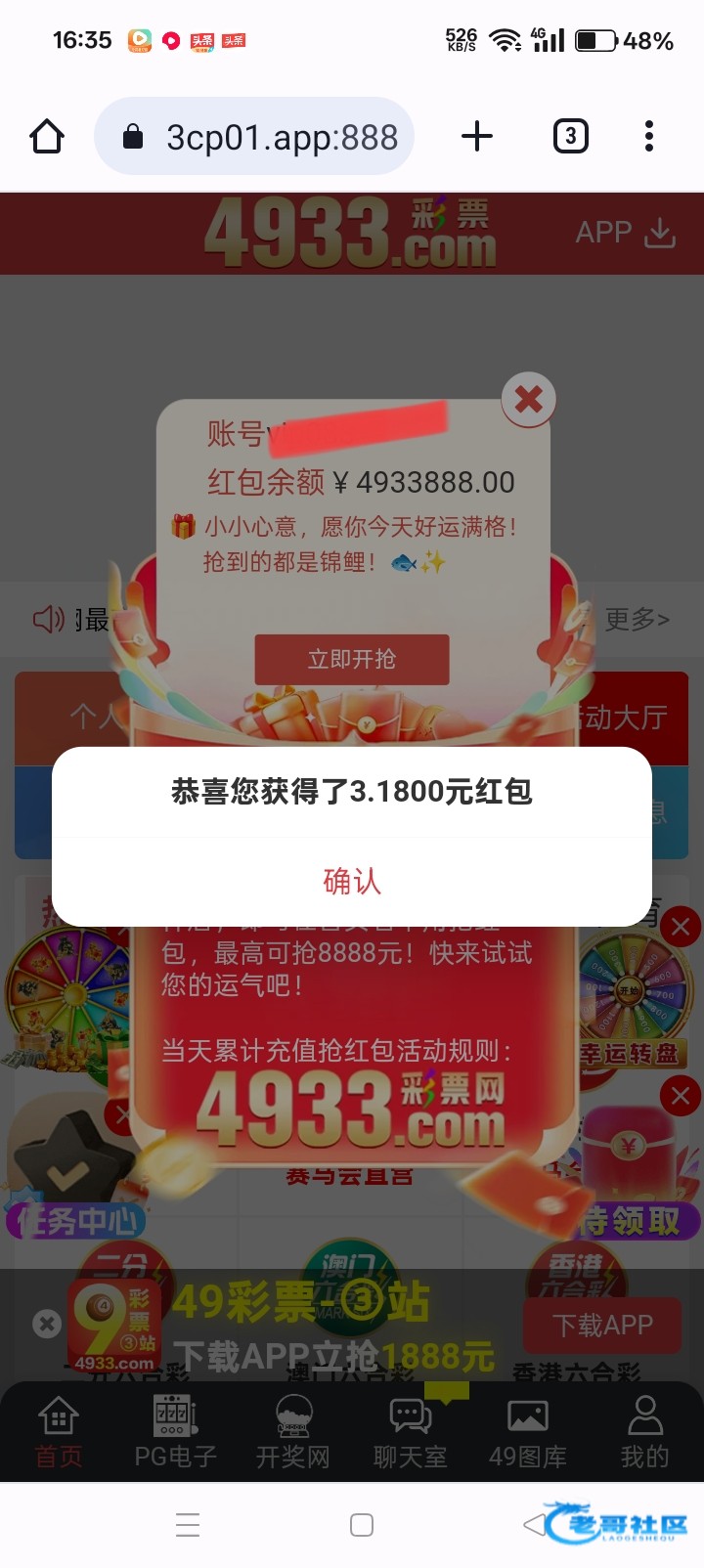 网站4933.com,免费红包有号可以上去看看,就刚出来的时候我充过首存30。今天上去试了一下抢了8块。