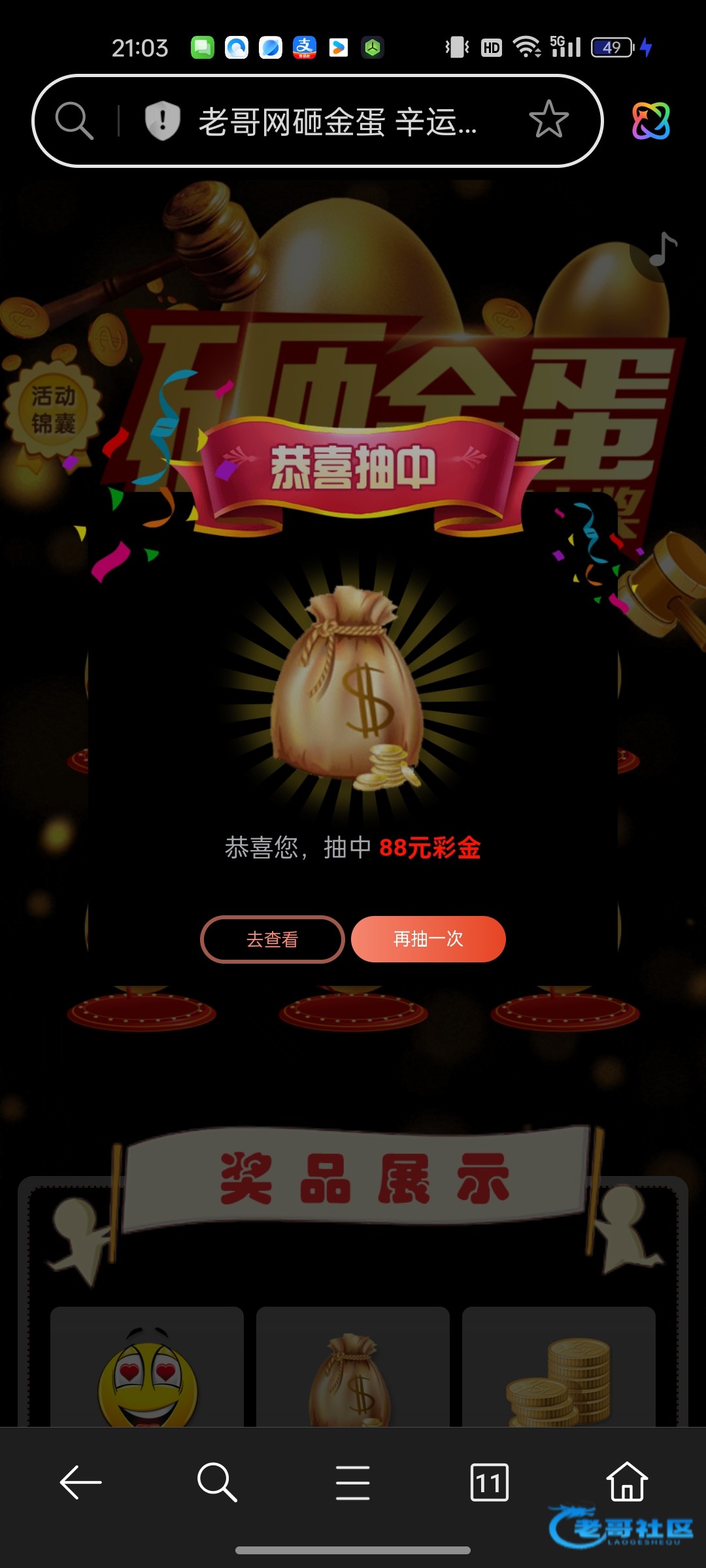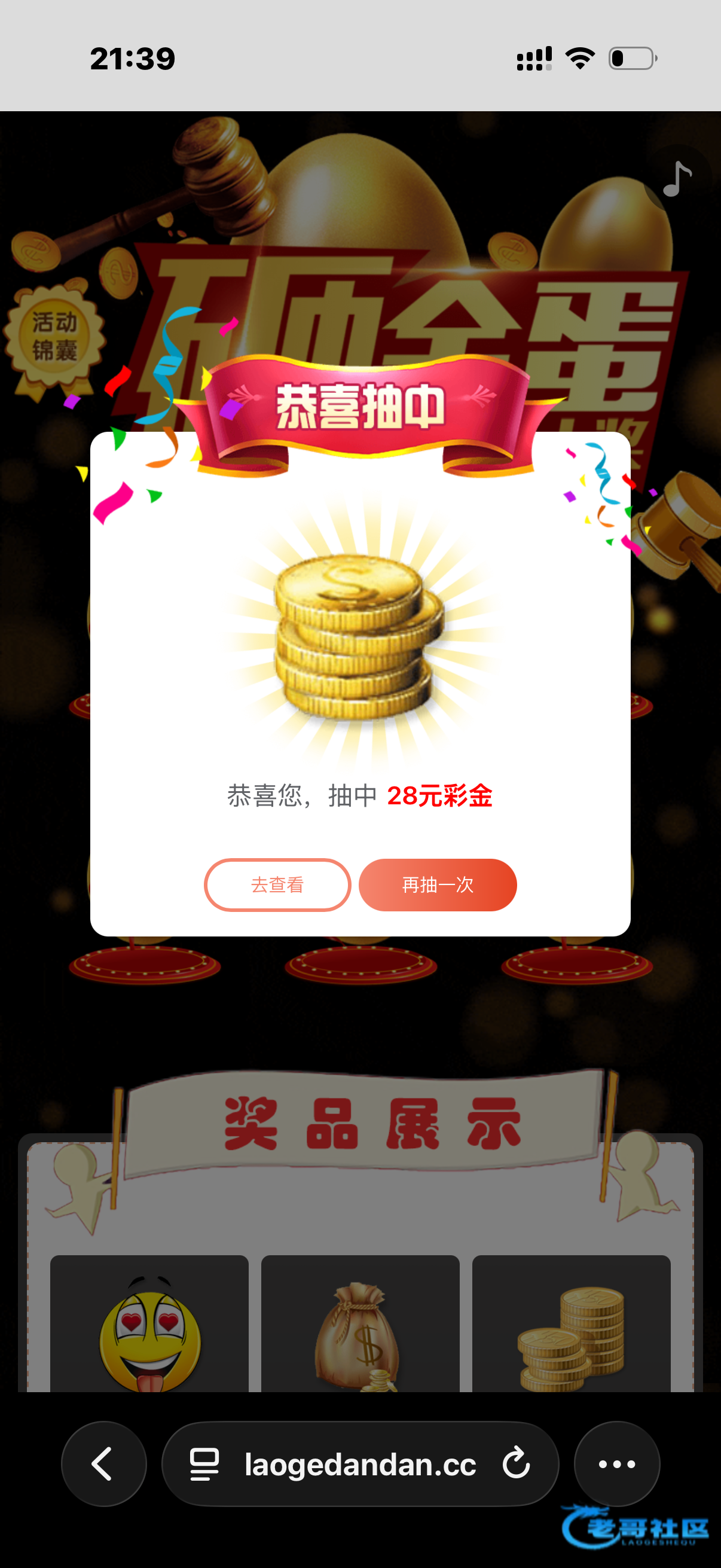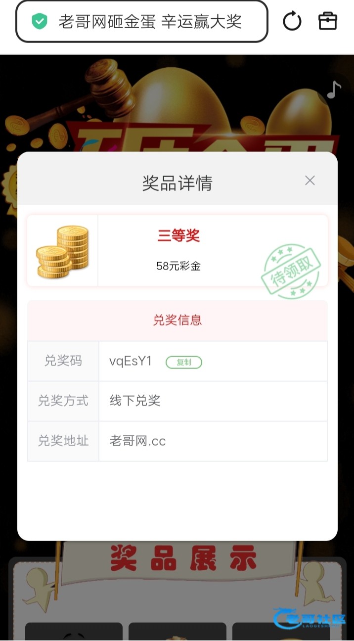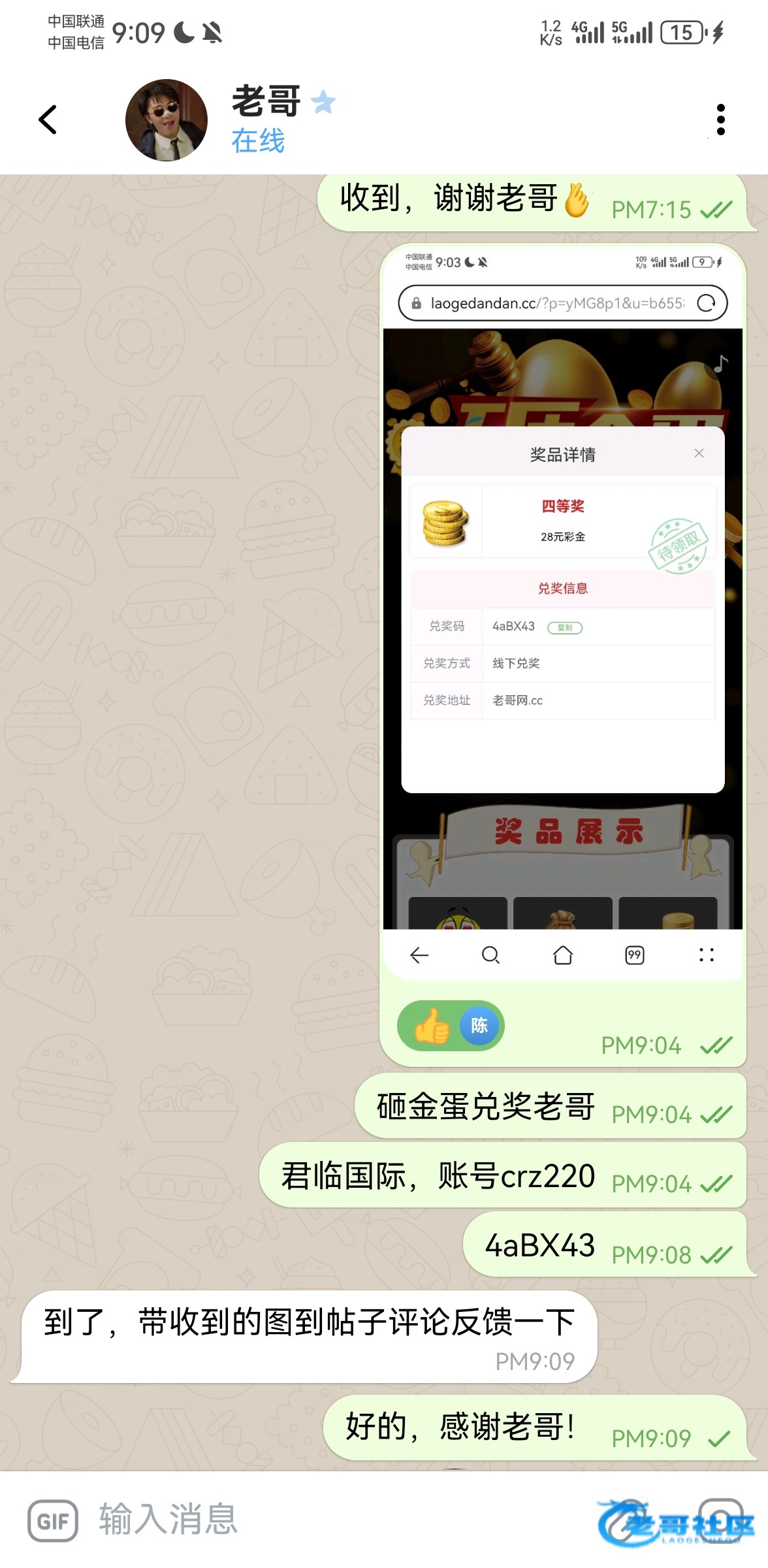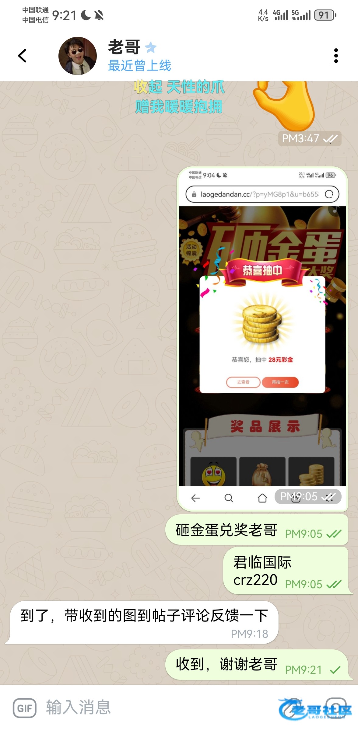 收到老哥砸金蛋28彩金,老哥网越来越好