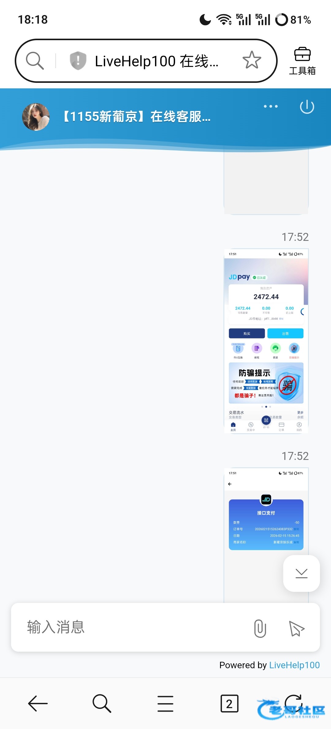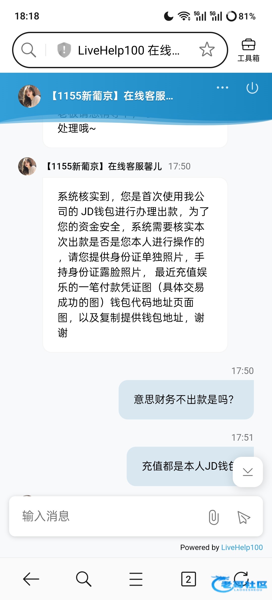系统核实到,您是首次使用我公司的 JD钱包进行办理出款,为了您的资金安全,系统需要核实本次出款是否是您本人进行操作的 ,请您提供身份证单独照片,手持身份证露脸照片, 最近充值娱乐的一笔付款凭证图(具体交易成功的图)钱包代码地址页面图,以及复制提供钱包地址,谢谢