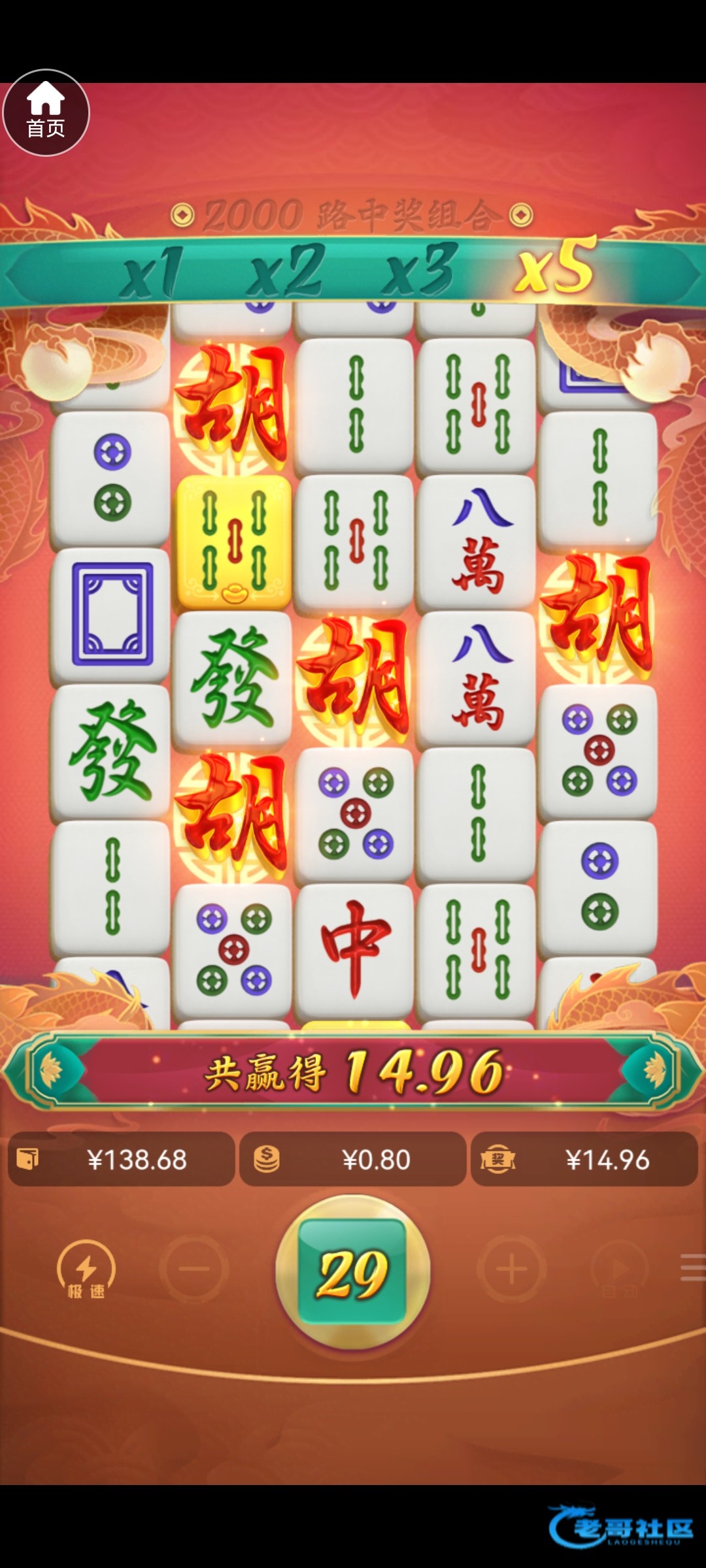 拉0.6两分钟不到胡到210,然后1,1.4,1.6全部空转,流水够了,钱没啦,唉,可惜