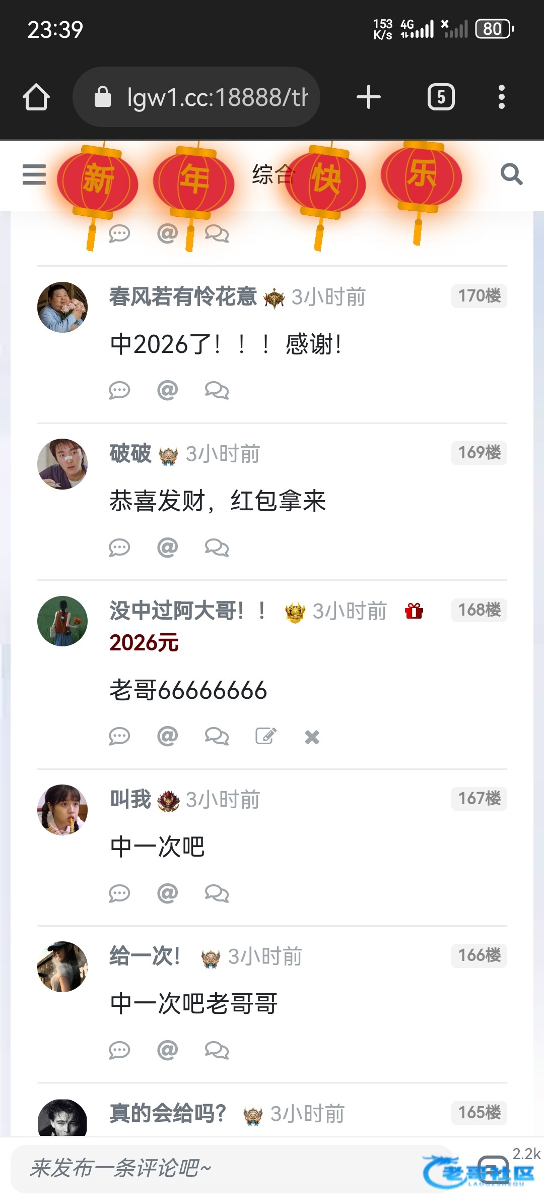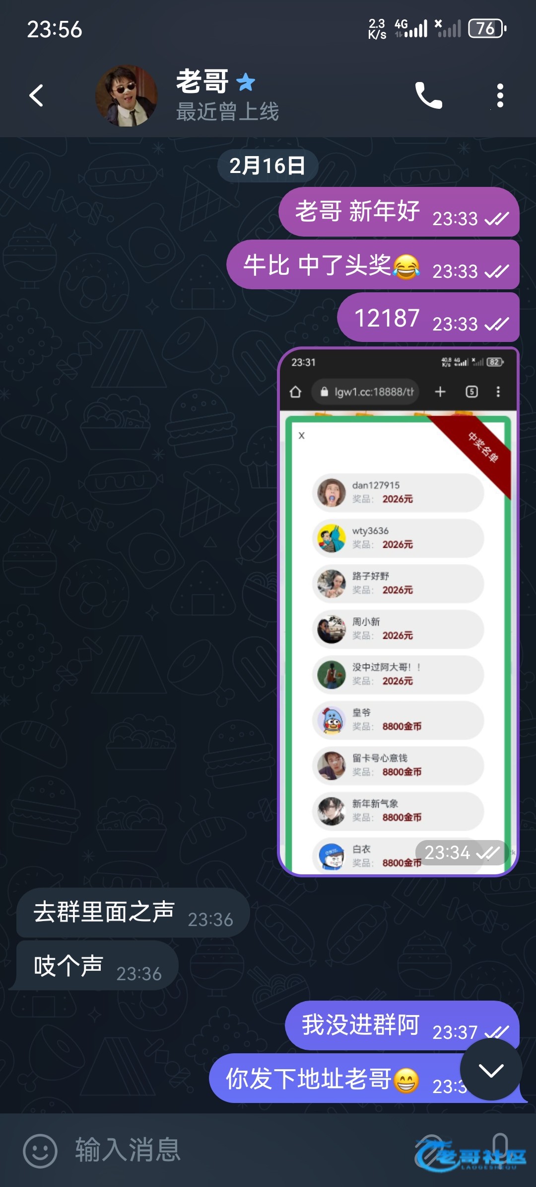 惊喜中奖!感谢老哥,我是168楼哈哈哈哈哈哈,来老哥网一年多了,第一次发帖不多说啥了,支持老哥网就完事了。